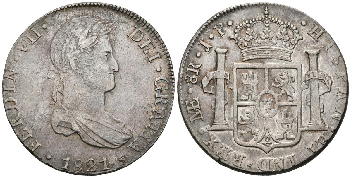 FERNANDO VII. 8 Reales. 1821. Lima JP. Cal-489. Ar. 26,94g. Bonita pátina. MBC+.