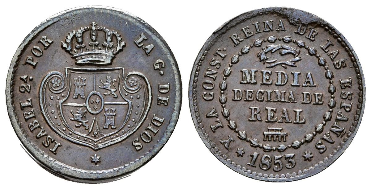 ISABEL II. 1/2 Décima de Real. 1853. Segovia. Cal-586. Ae. 1,88g. Bonito color. EBC.
