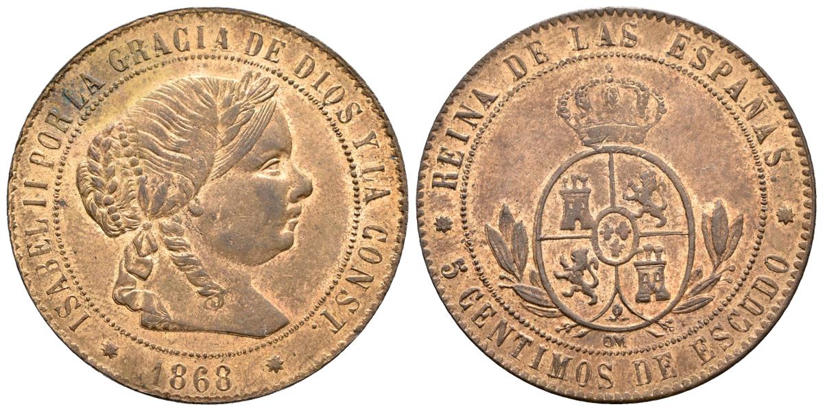 ISABEL II. 5 Céntimos de escudo. 1868. Barcelona OM. Cal-625. Ae. 11,75g. Brillo original. EBC-.