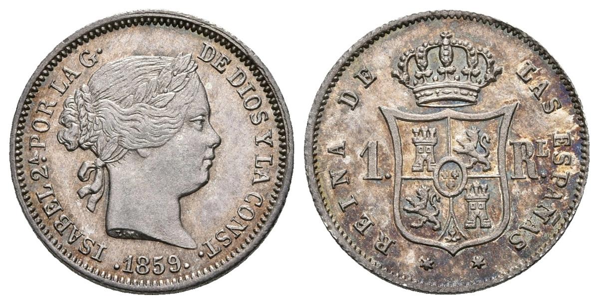 ISABEL II. 1 Real. 1859. Madrid. Cal-421. Ar. 1,35g. Magnífica pátina y restos de brillo original. SC-.