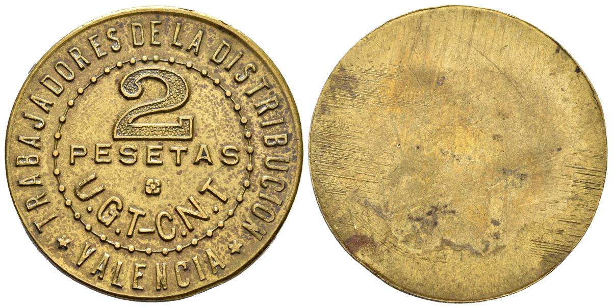 TRABAJADORES DE LA DISTRIBUCION. U.G.T.-C.N.T. 2 Pesetas. Valencia. Latón. 7,83g. MBC+. Escasa.