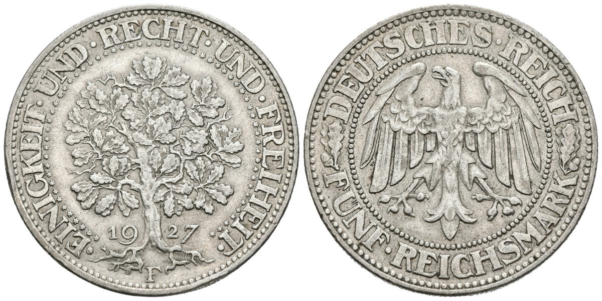 ALEMANIA. 5 Reichmark. 1927. Weimar Republic. Stuttgart F. Km#56. Ar. 24,90g. Golpecito en el canto. MBC+.