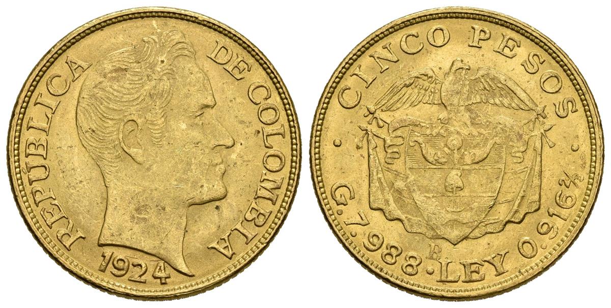 COLOMBIA. 5 Pesos. 1924. Bogotá B. Km#201.1. Au. 8,16g. Marquitas. MBC+.