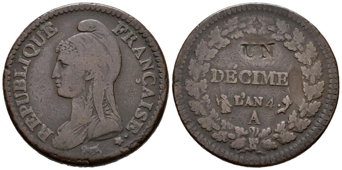 FRANCIA. 1 Decime an 4 A. 1793-1804. Contramarca UN sobre 2 Decimes. Km#637.1; Gadoury 186. Ae. 21,28g. MBC-.