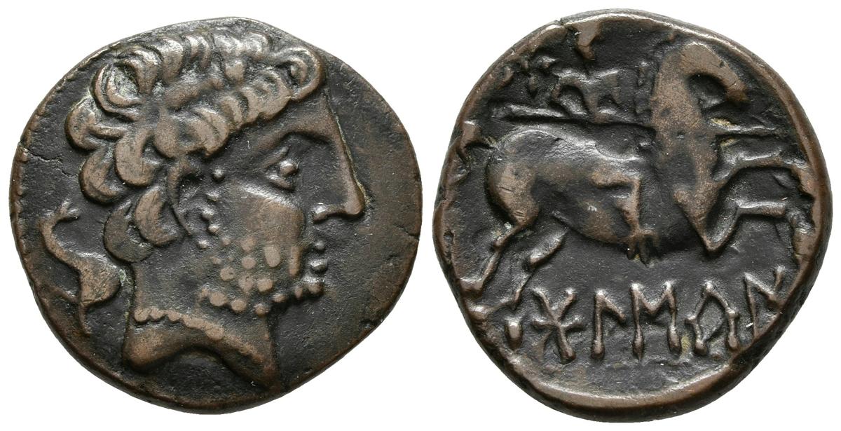 BOLSCAN. As. 180-20 a.C. Huesca. A/ Cabeza barbada a derecha, detrás delfín. R/ Jinete con lanza a derecha, encima estrella. FAB-1918. Ae. 7,77g. MBC+.