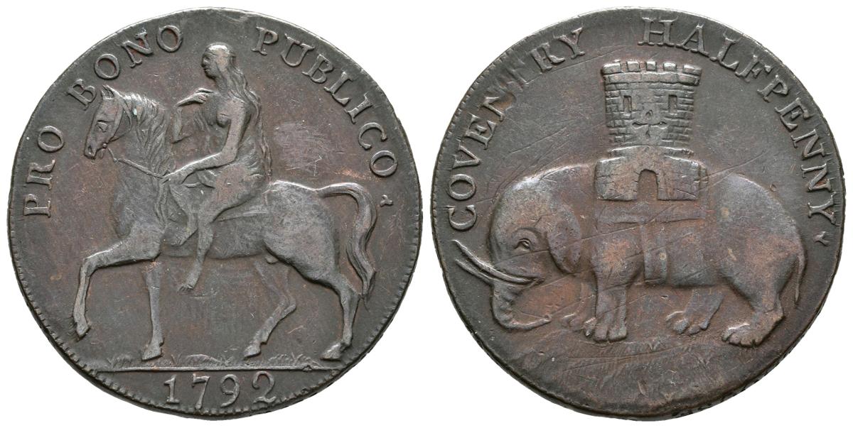 GRAN BRETAÑA. 1/2 Penny Token. 1792. Coventry. A/ Lady Godiva a caballo. PRO BONO PUBLICO, en exergo 1792. R/ Elefante a izquierda con torre sobre él, también sobre este, COVENTRY HALFPENNY. D&H Warwickshire 231. Ae. 11,94g. MBC.