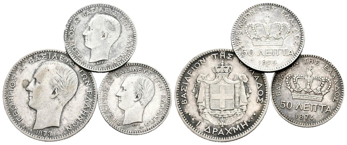 GRECIA. 50 Lepta 1874 A (2) Km#37 y 1 Dracma 1873 A. Km#39. Ar. MBC-/MBC.
