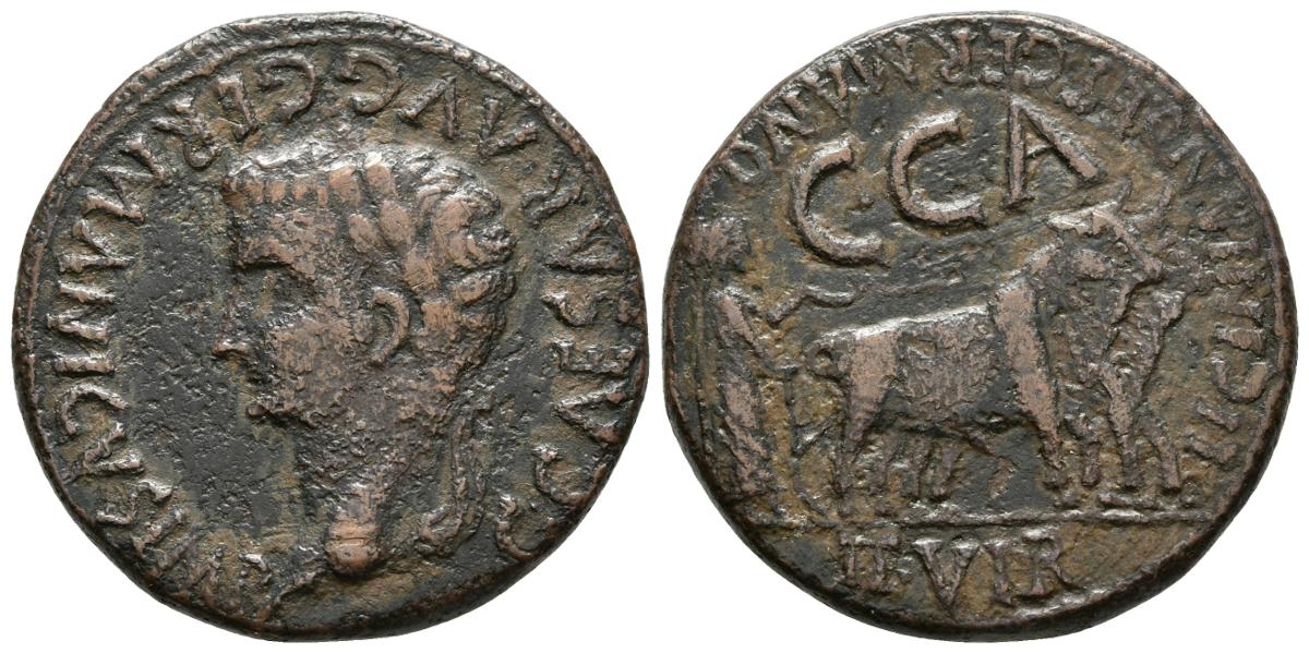 CAESARAUGUSTA. As. Epoca de Calígula. 37-41 d.C. Zaragoza. A/ Cabeza laureada de Calígula a izquierda. C. CAESAR AVG. GERMANICVS IMP. R/ Yunta a derecha encima CCA, alrededor C. C. A. LICINIANO ET GERMANO II VIR. FAB-391. Ae. 13,05g. MBC.