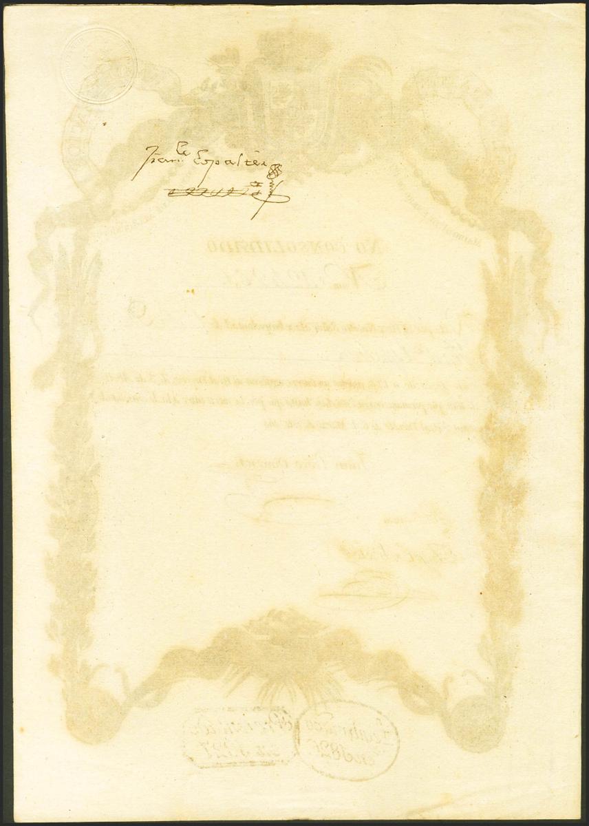 English 100 pesos for 128 Cuartos. January 1, 1824. Without series and with numbering. (not catalogued). Very rare real voucher, signed inside. Almost Uncirculated.