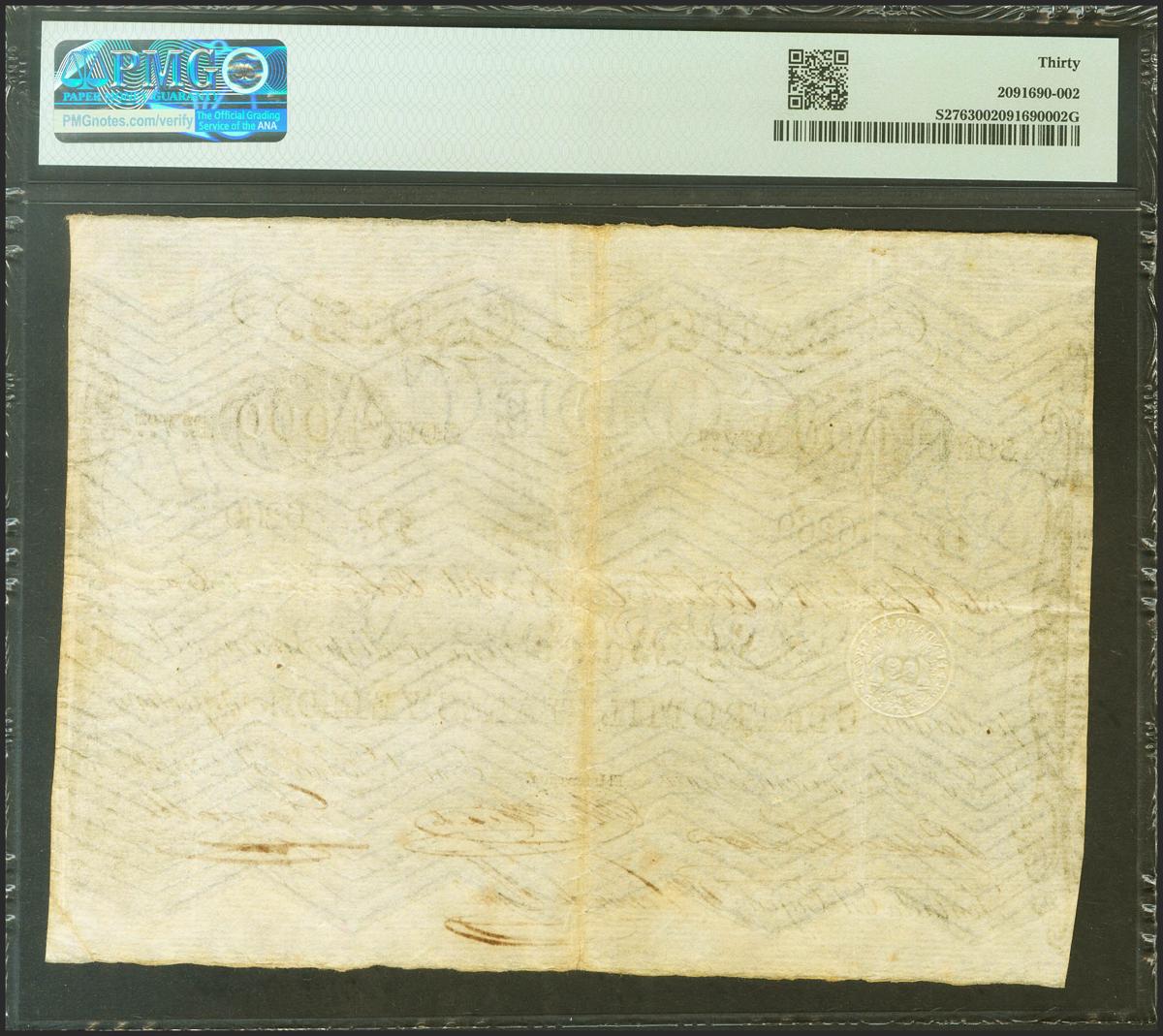 BANK OF CADIZ. Issue I. 4000 Reales. October 18, 1860 (dated by hand). Four signatures and dry seal. (Edifil 2021: 75, Pick: S276). Very rare and common erosions that accompany the folds. Very Fine. PMG30 package.
