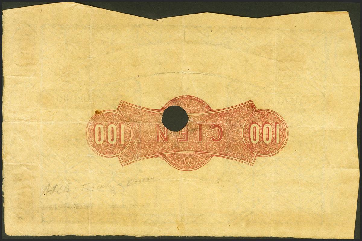 100 Reales. May 14, 1857. Bank of Zaragoza. Series A, with hole and signatures. (Edifil 2021: 126A). Unusual. Good Very Fine.