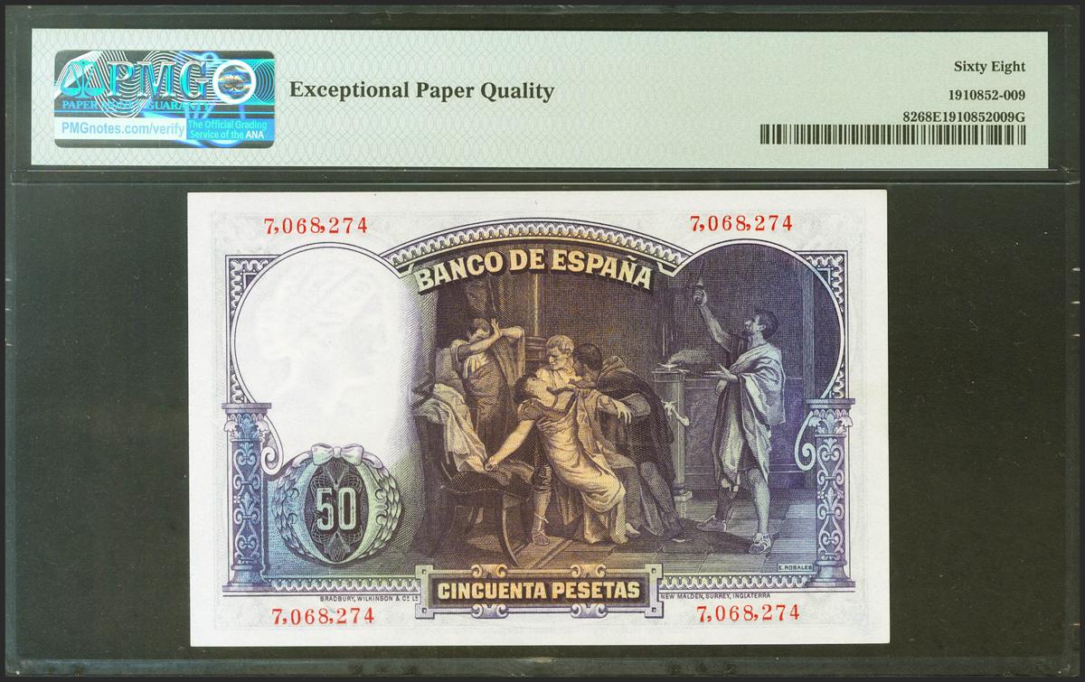 50 pesetas. April 25, 1931. No series. (Edifil 2021: 359, Pick: 82). Very rare in this exceptional quality, original sizing. Uncirculated. PMG68EPQ package. (to give us an idea of the rarity, as of March 1, 2023, this bill is the best rated along with another bill in PMG)