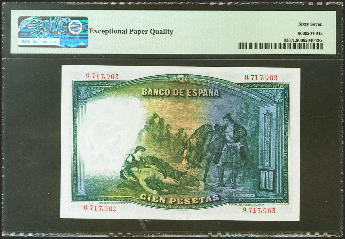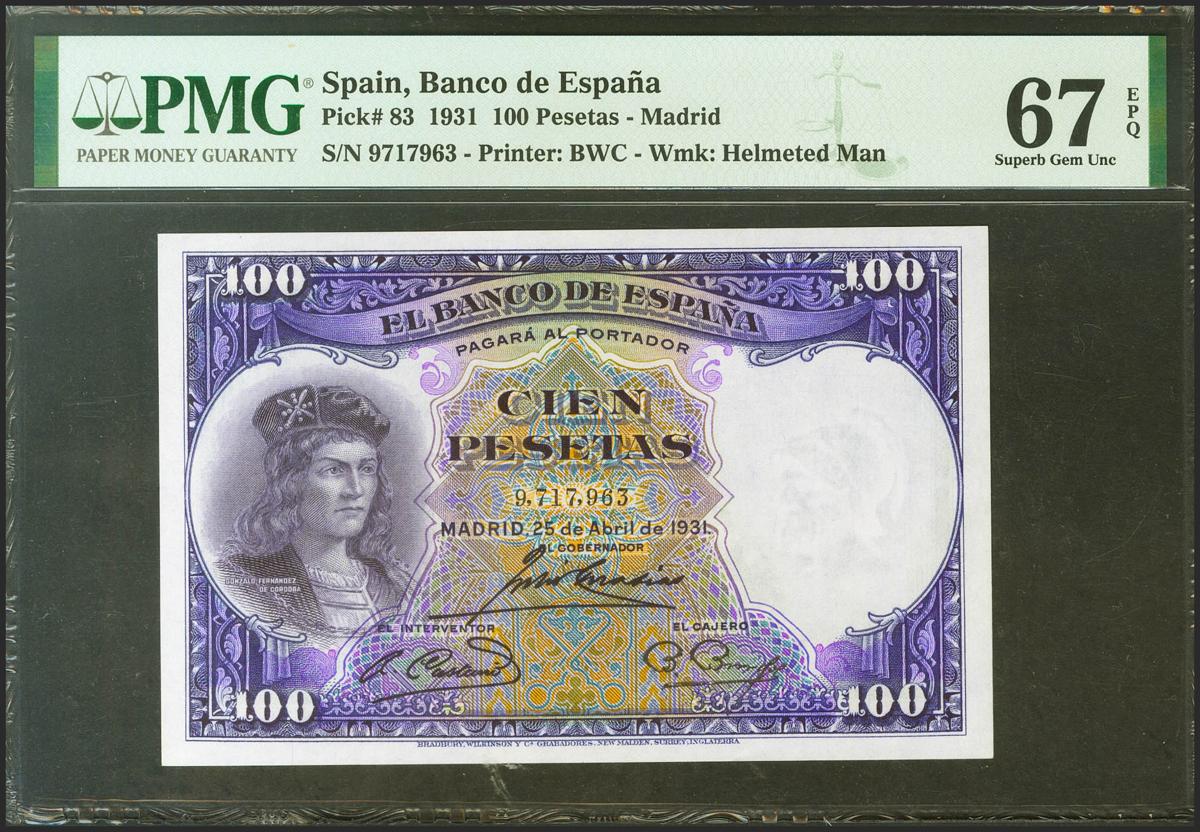 100 pesetas. April 25, 1931. No series. (Edifil 2021: 360, Pick: 83). Rare in this exceptional quality, original sizing. Uncirculated. PMG67EPQ package.