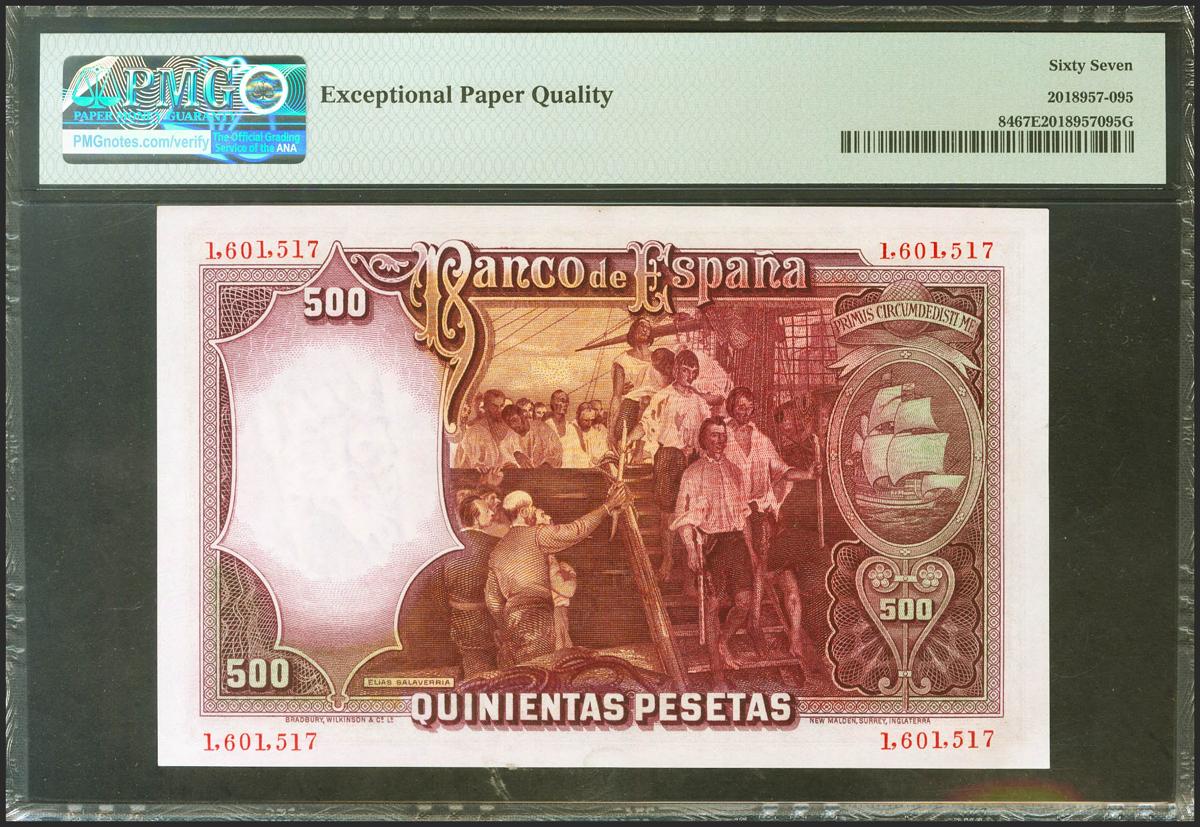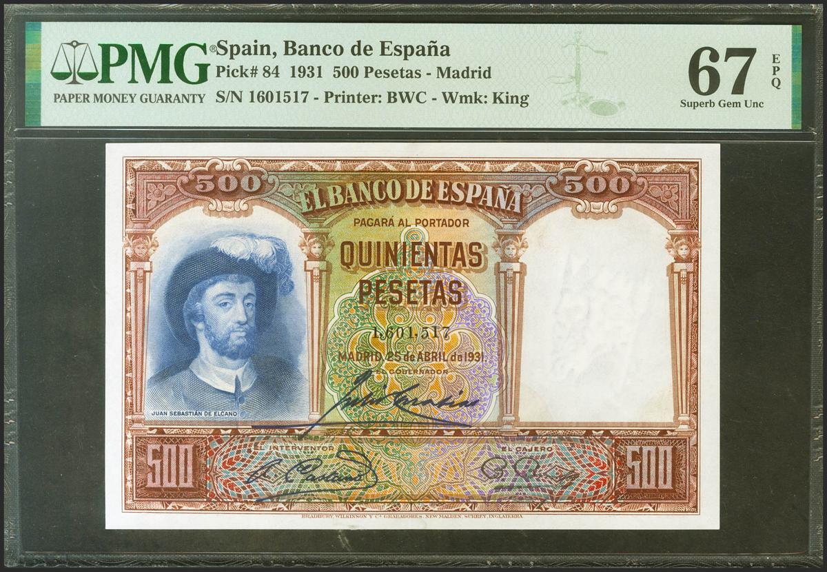 500 pesetas. April 25, 1931. No series. (Edifil 2021: 361, Pick: 84). Very rare in this exceptional quality, original sizing. Uncirculated. PMG67EPQ package.