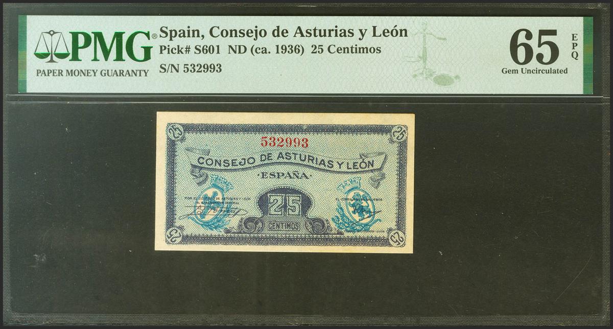 English 25 cents. 1937. Asturias and Leon. No serie. (Edifil 2021: 394, Pick: S601). original sizing Uncirculated. PMG65EPQ package.