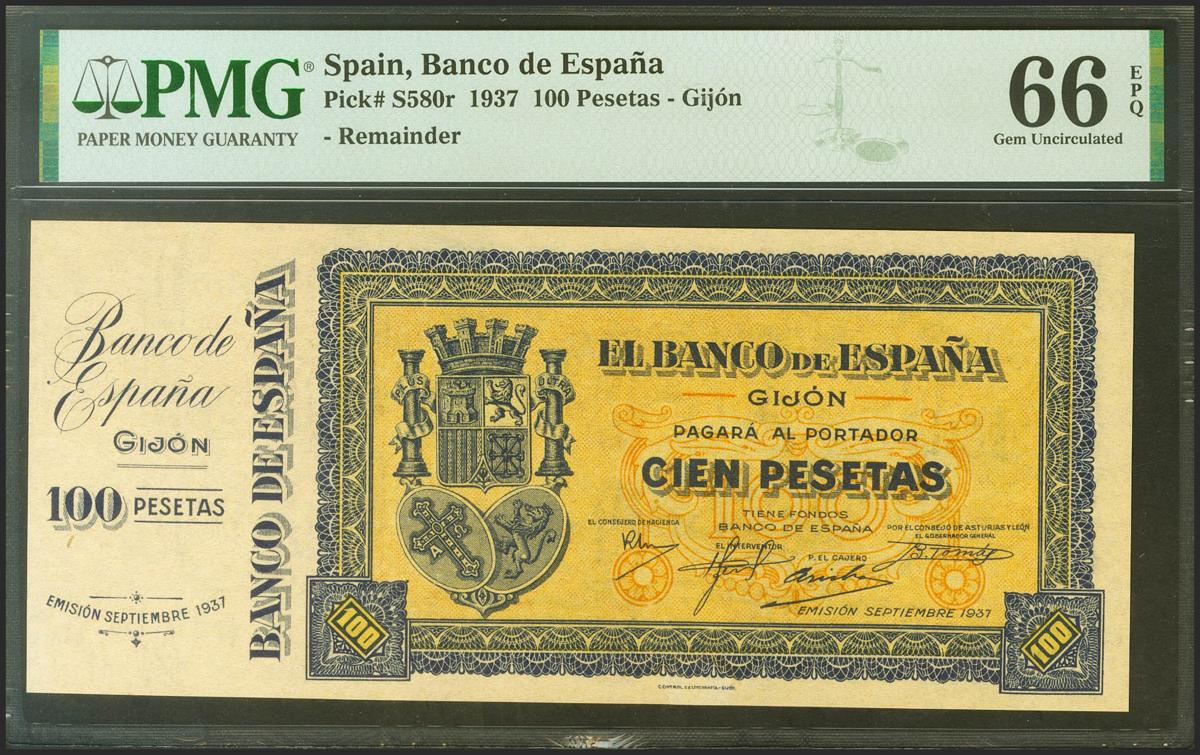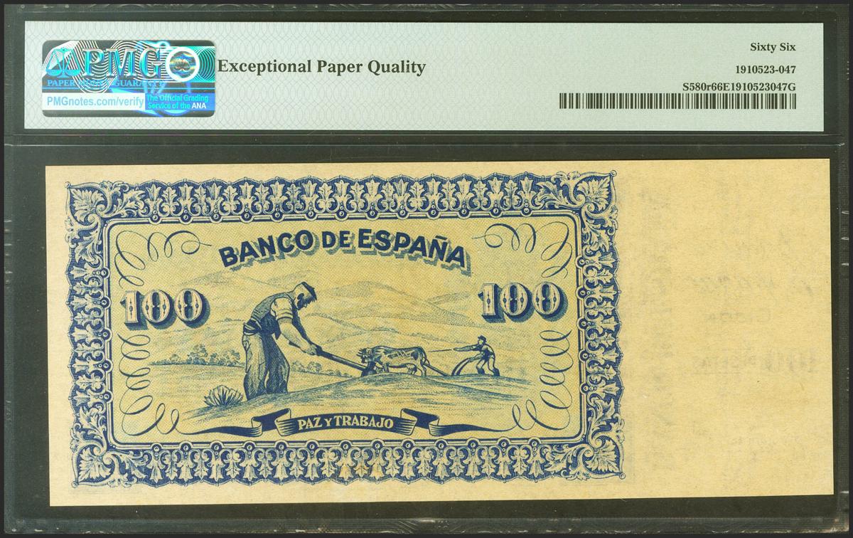 100 pesetas. September 1937. Without series, without numbering and with matrix on the left. (Edifil 2021: 399a, Pick: S580r). Rare in this exceptional quality, original sizing. Uncirculated. PMG66EPQ package.