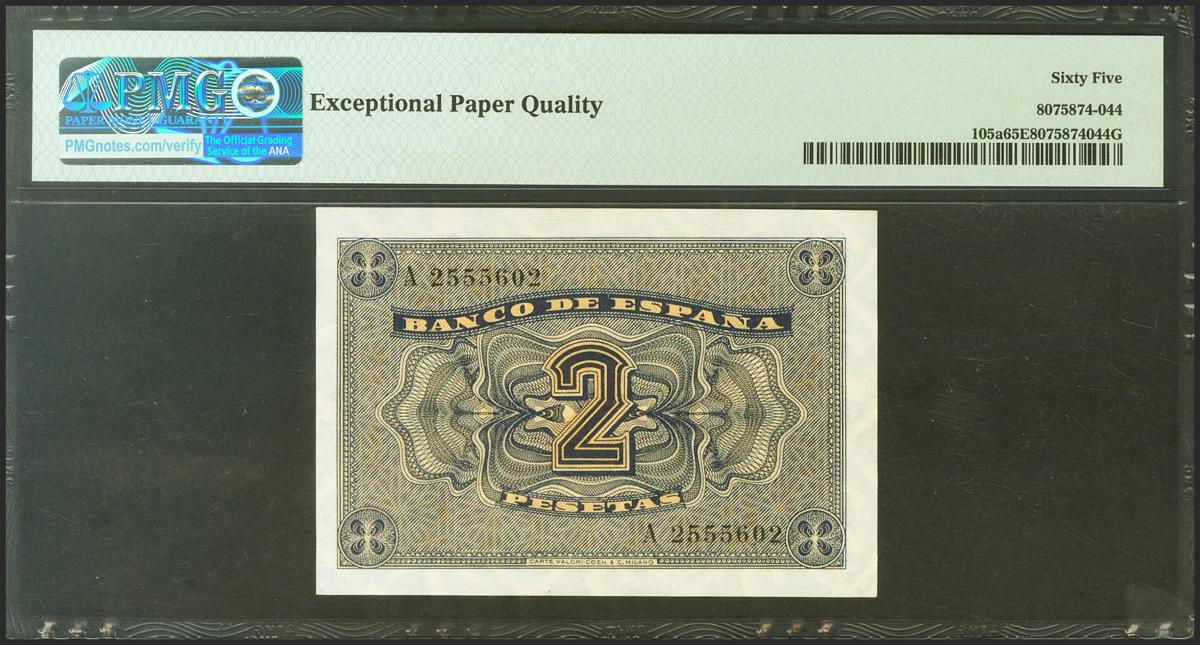 2 pesetas. October 12, 1937. Series A. (Edifil 2021: 426, Pick: 105a). Rare in this exceptional quality, original sizing. Uncirculated. PMG65EPQ package.