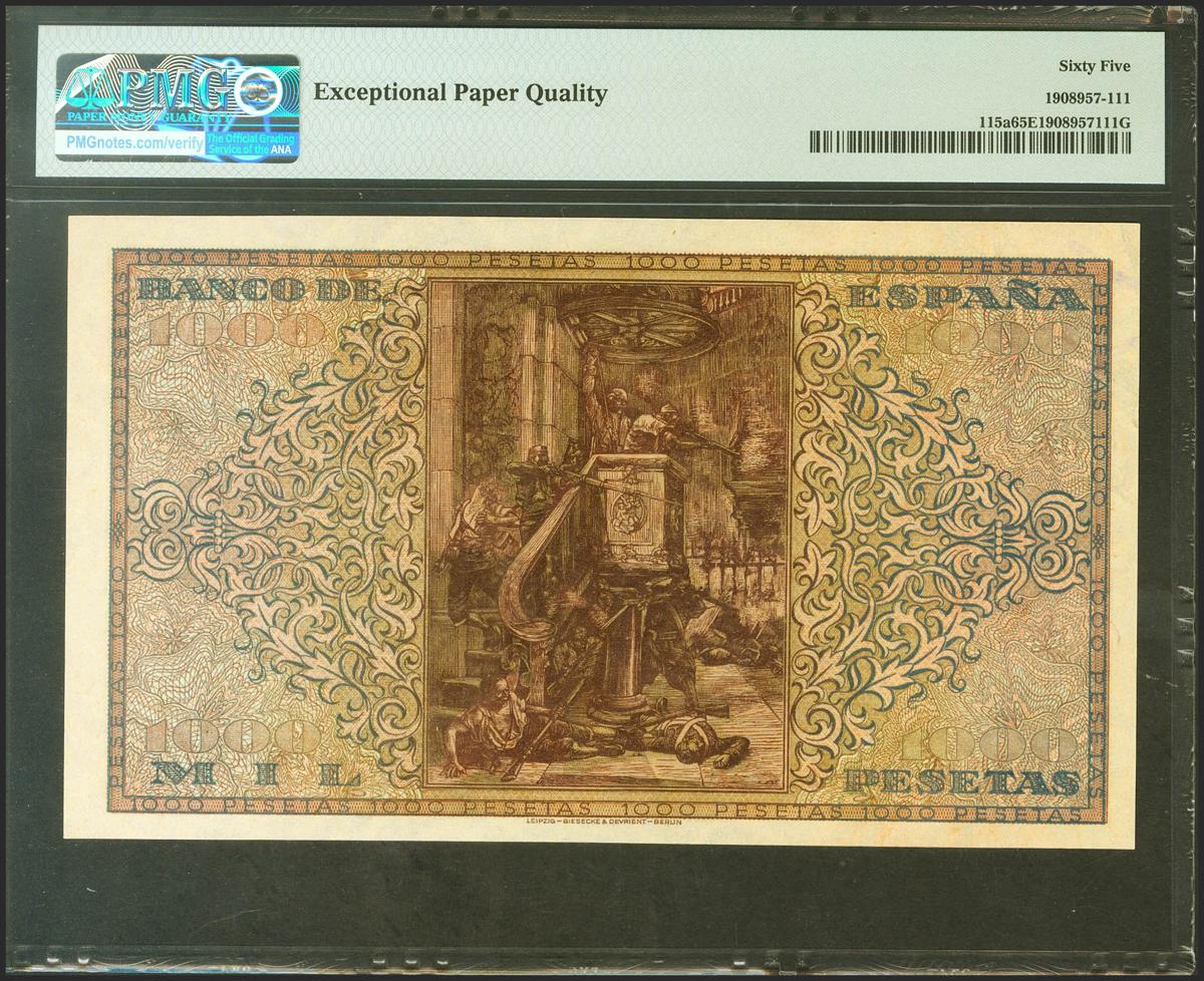 1000 pesetas. May 20, 1938. Series A. (Edifil 2021: 434, Pick: 115a). Extremely rare, especially in this exceptional quality, original sizing. Uncirculated. PMG65EPQ package.