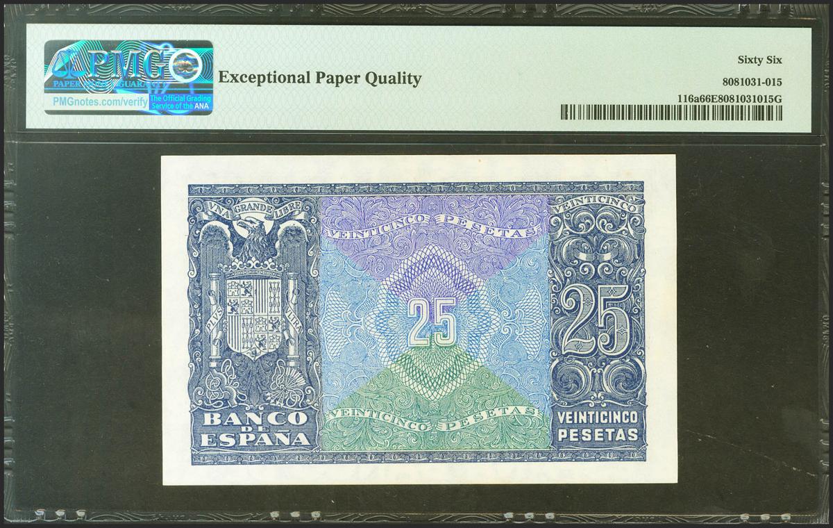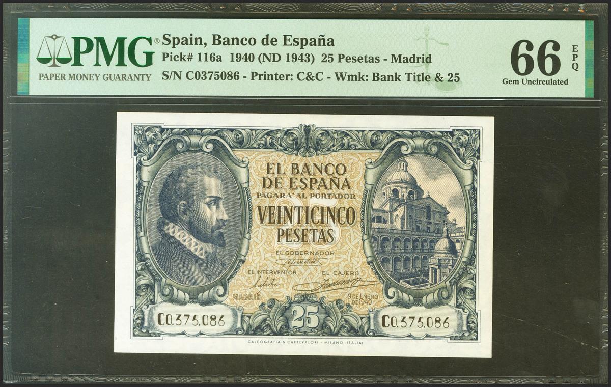 English 25 pesetas. January 9, 1940. Series C. (Edifil 2021: 436a, Pick: 116a). Rare in this quality, original sizing. Uncirculated. PMG66EPQ package.