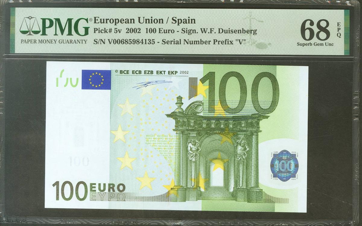 100 euros. January 1, 2002. Signature Duisenberg. Series V (Spain). (Edifil 2021: 490, Pick: 18v). Uncirculated. PMG68EPQ package.