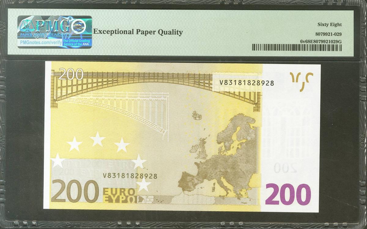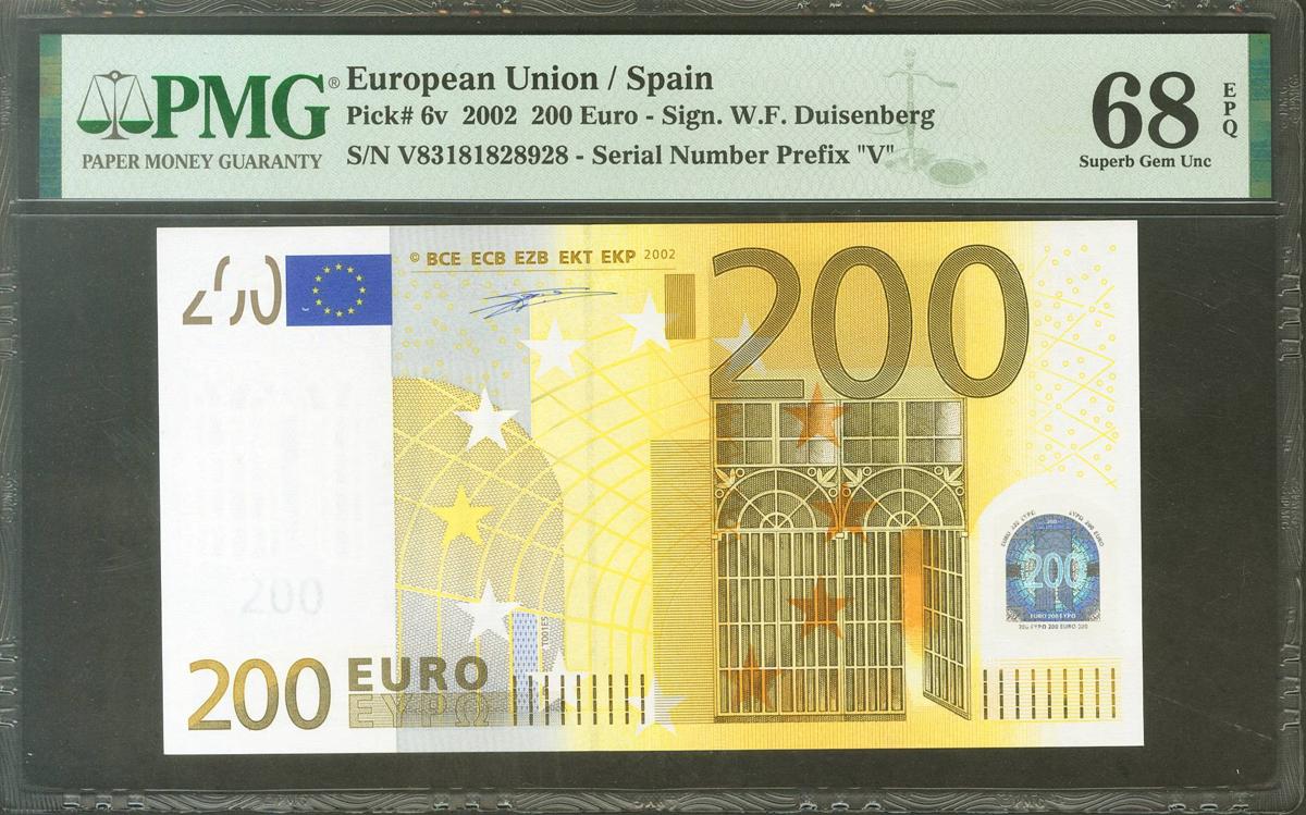 200 euros. January 1, 2002. Signature Duisenberg. Series V (Spain). (Edifil 2021: 491, Pick: 6v). Uncirculated. PMG68EPQ package.