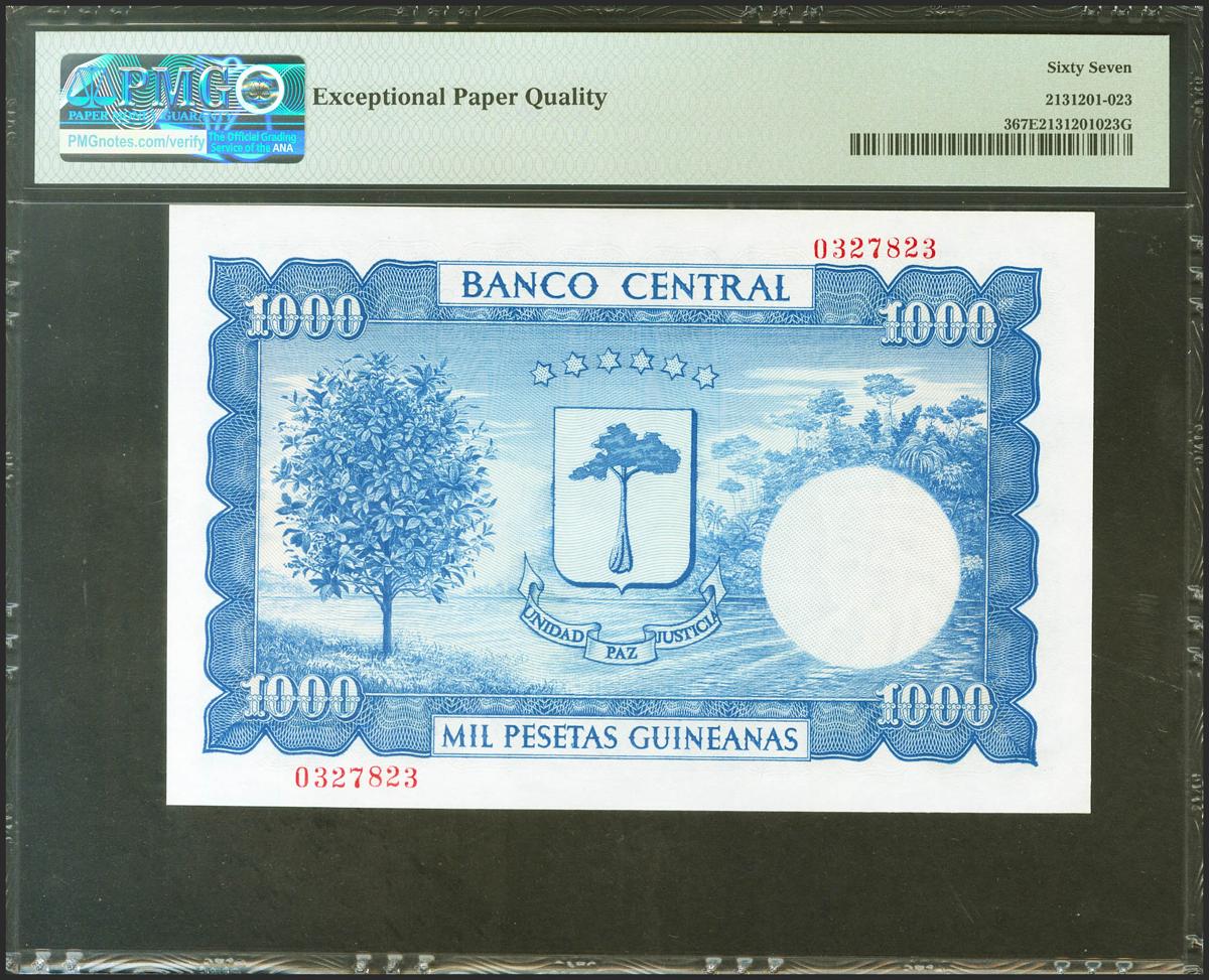 English EQUATORIAL GUINEA. 1000 pesetas. October 12, 1969. Without series. (Pick: 3). Very rare in this exceptional quality, original sizing. Uncirculated. PMG67EPQ package.