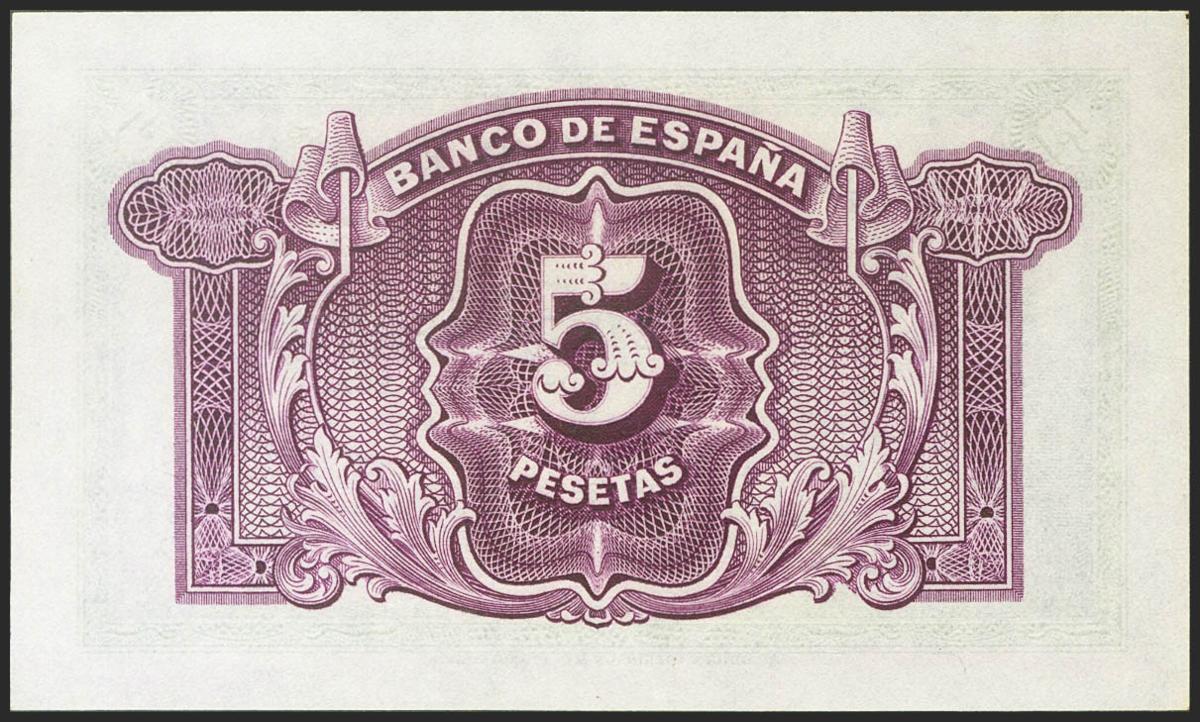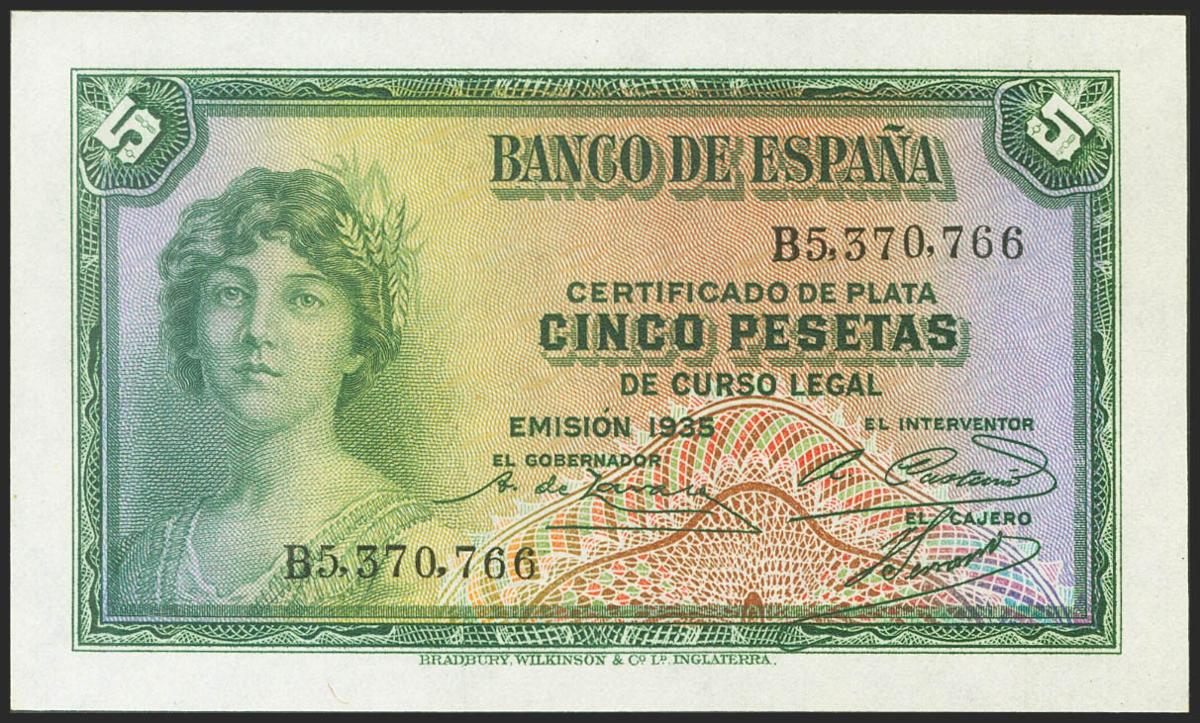 English 5 pesetas. 1935. Silver Certificate. Series B. (Edifil 2021: 363a). It retains all its original sizing. Uncirculated.