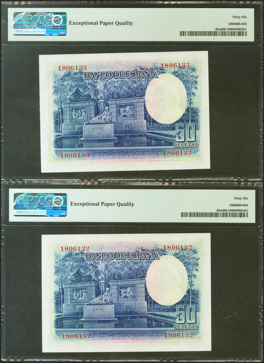 50 pesetas. June 22, 1935. Correlative couple. No serie. (Edifil 2021: 366, Pick: 88a). original sizing Uncirculated. PMG66EPQ packages, both.
