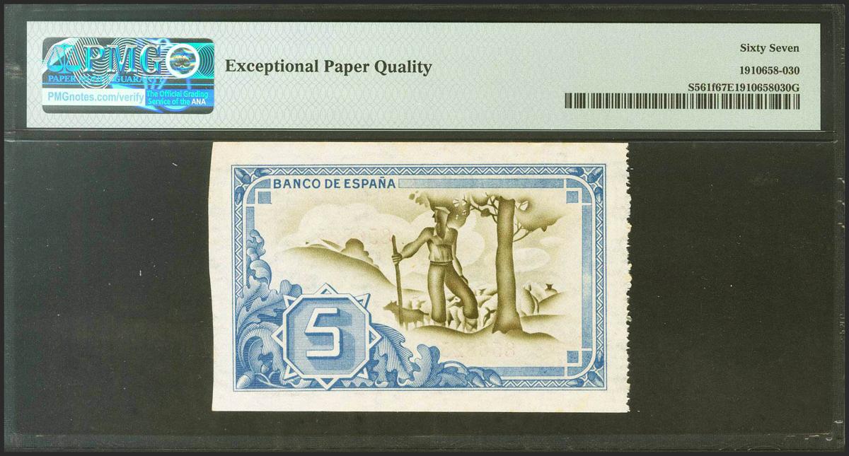 5 pesetas. January 1, 1937. Bilbao branch, countersignature of Banco de Vizcaya. Without series, with numbering and without matrices. (Edifil 2021: 385f, Pick: S561f). Rare in this exceptional quality, original sizing. Uncirculated. PMG67EPQ package.