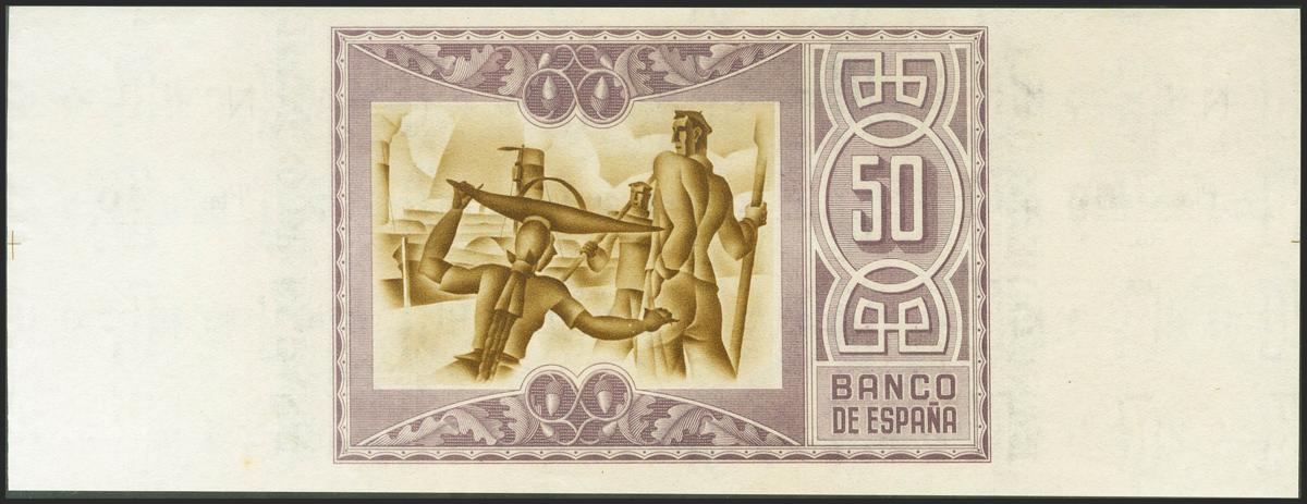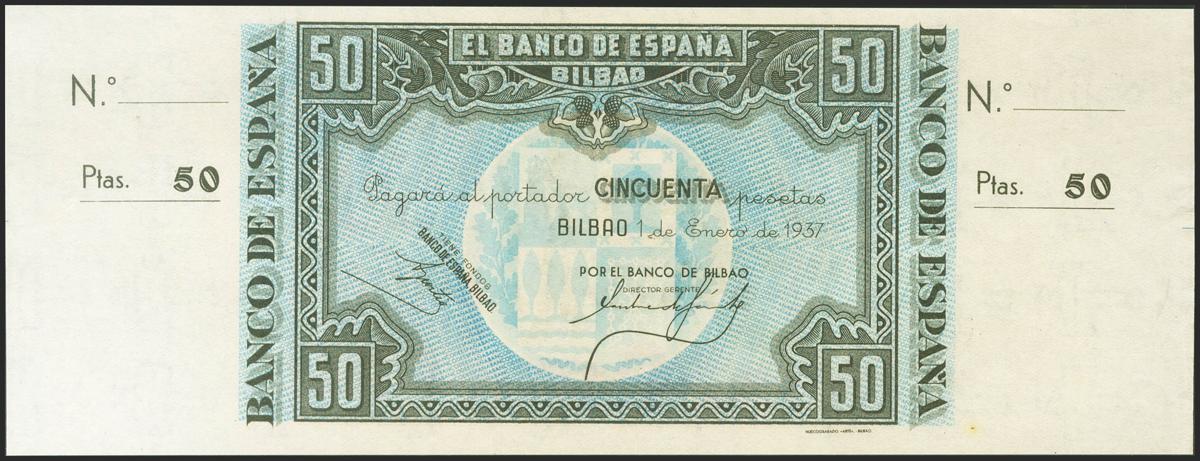 50 pesetas. January 1, 1937. Bilbao branch, presigned Banco de Bilbao. Without series and without numbering, with both matrices. (Edifil 2021: 389a). original sizing Almost Uncirculated.