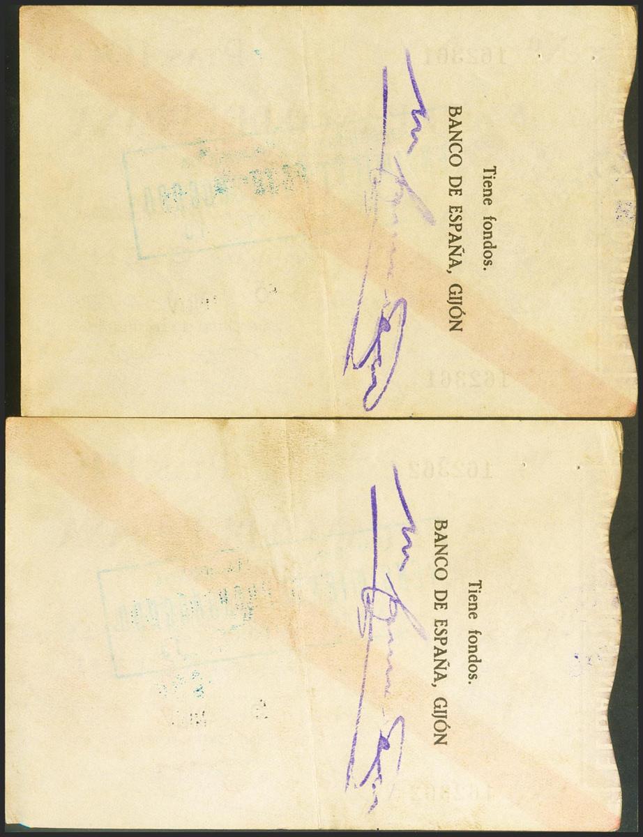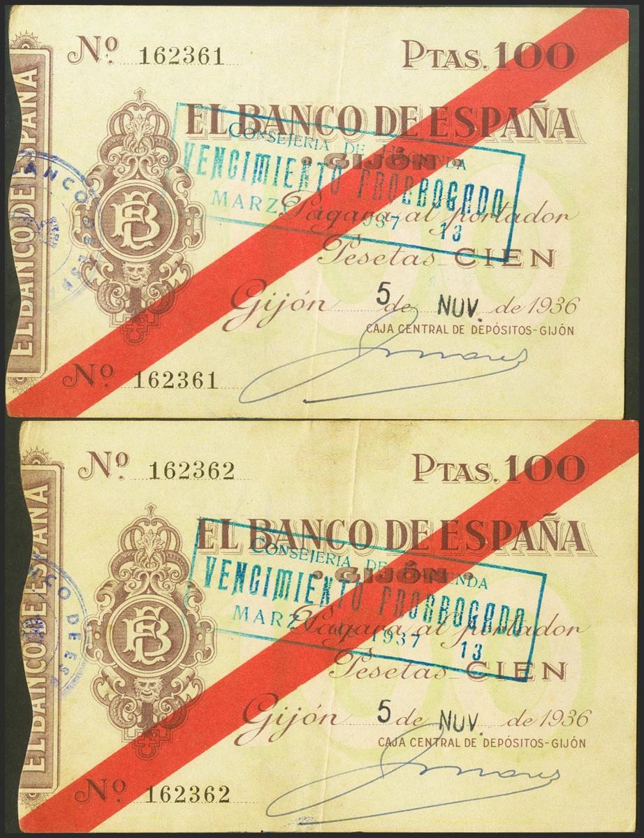 100 pesetas. November 5, 1936. Gijón branch. Correlative pair. No serie. (Edifil 2021: 384). Very rare pair, especially in this exceptional quality for this banknote, which is always in low quality. Good Extremely Fine.