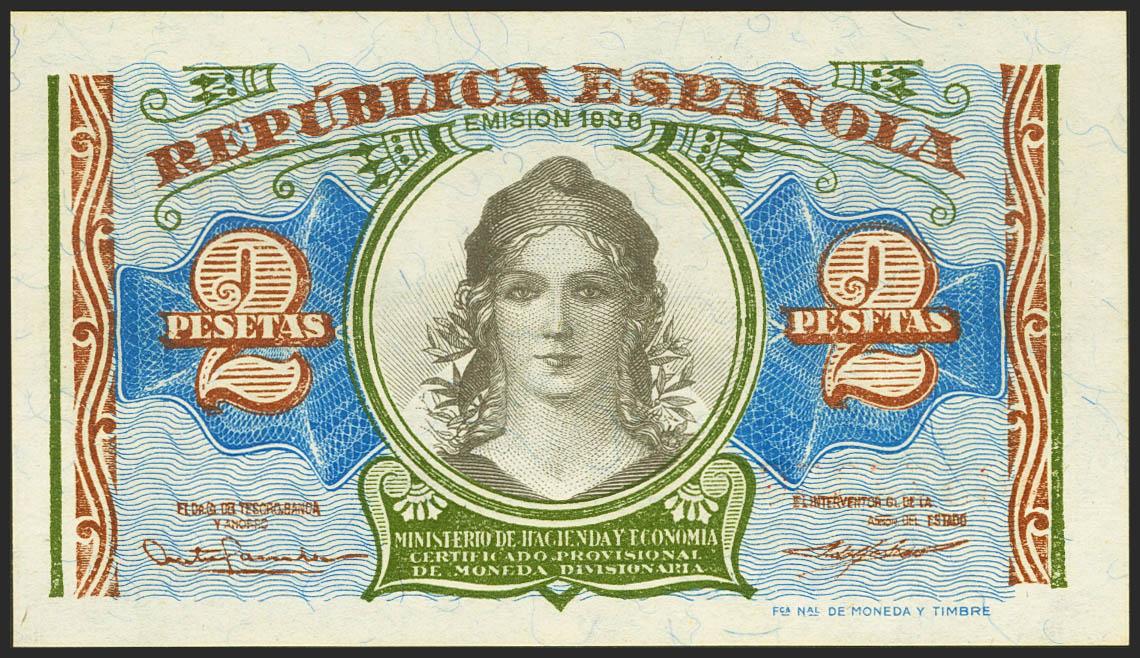 2 pesetas. 1938. Ministry of Finance. Series A. (Edifil 2021: 393). original sizing Uncirculated.
