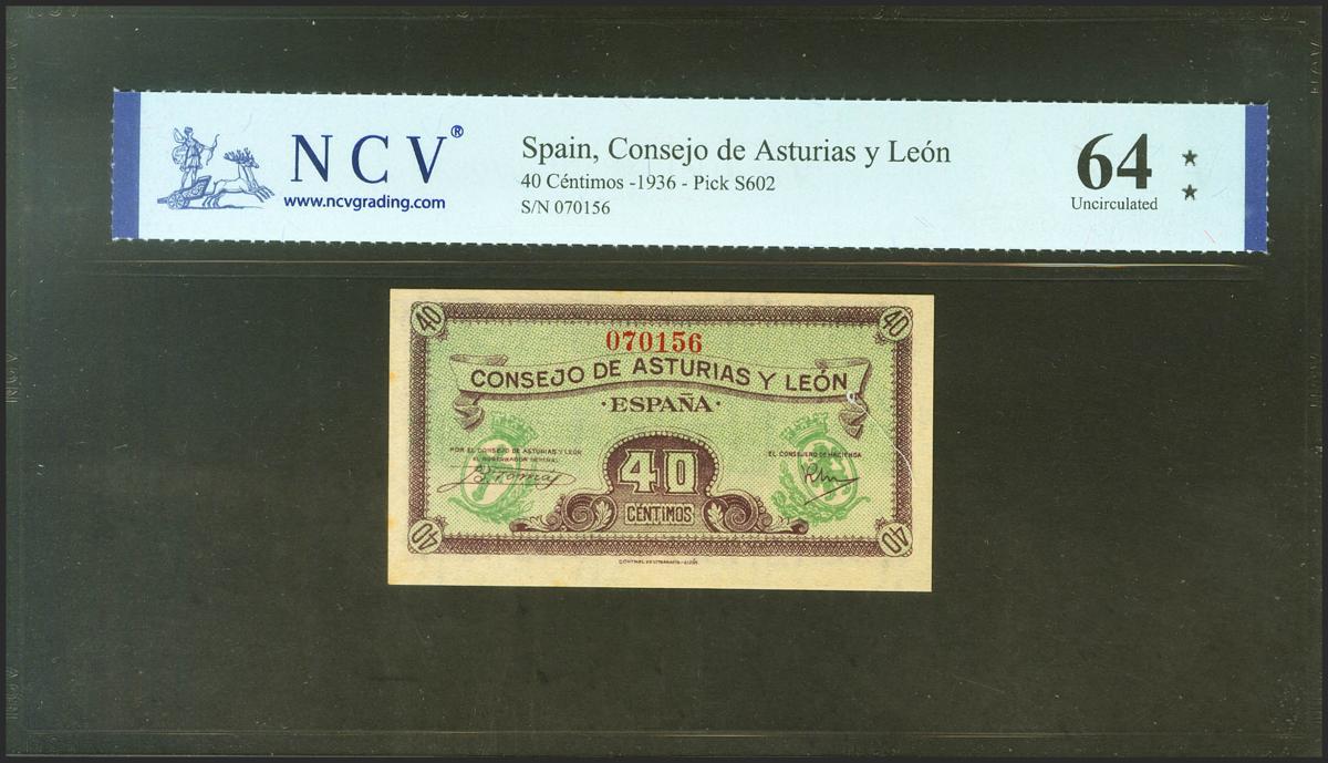 English 40 cents. 1937. Asturias and Leon. No serie. (Edifil 2021: 395, Pick: S602). Uncirculated. NCV64 encapsulation.
