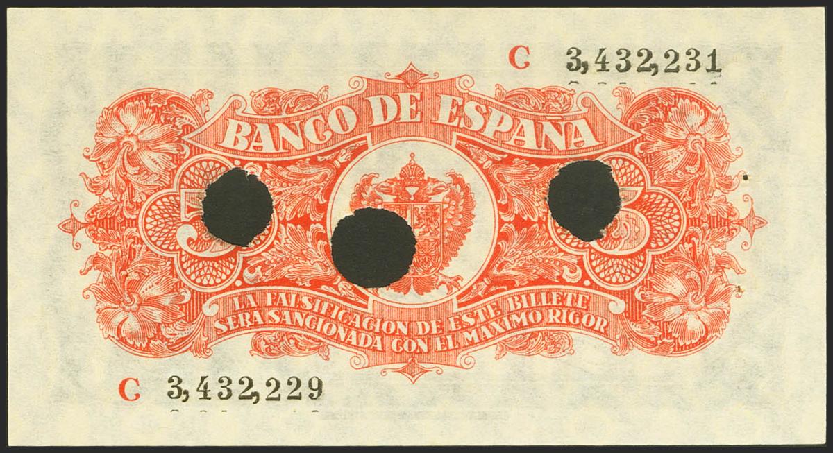 5 pesetas. June 18, 1937. Series C, last series issued, numbering error on the back that shows two jumps in the tens and units digits, drilled three times and with staple dots. (Edifil 2021: 424a). Very rare, original sizing. Almost Uncirculated.