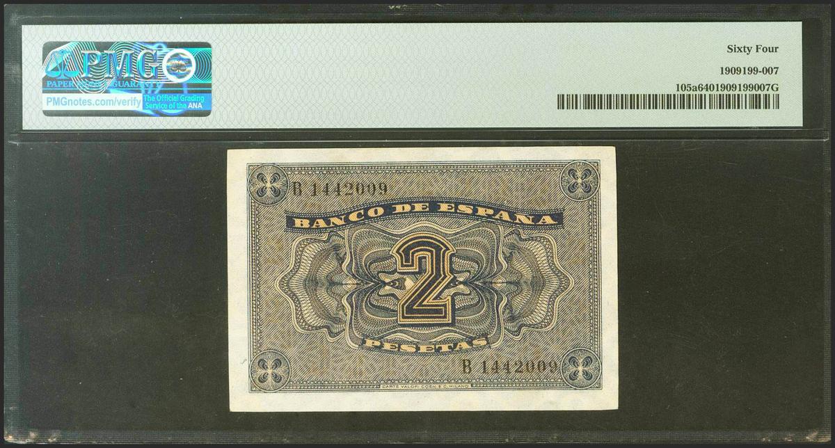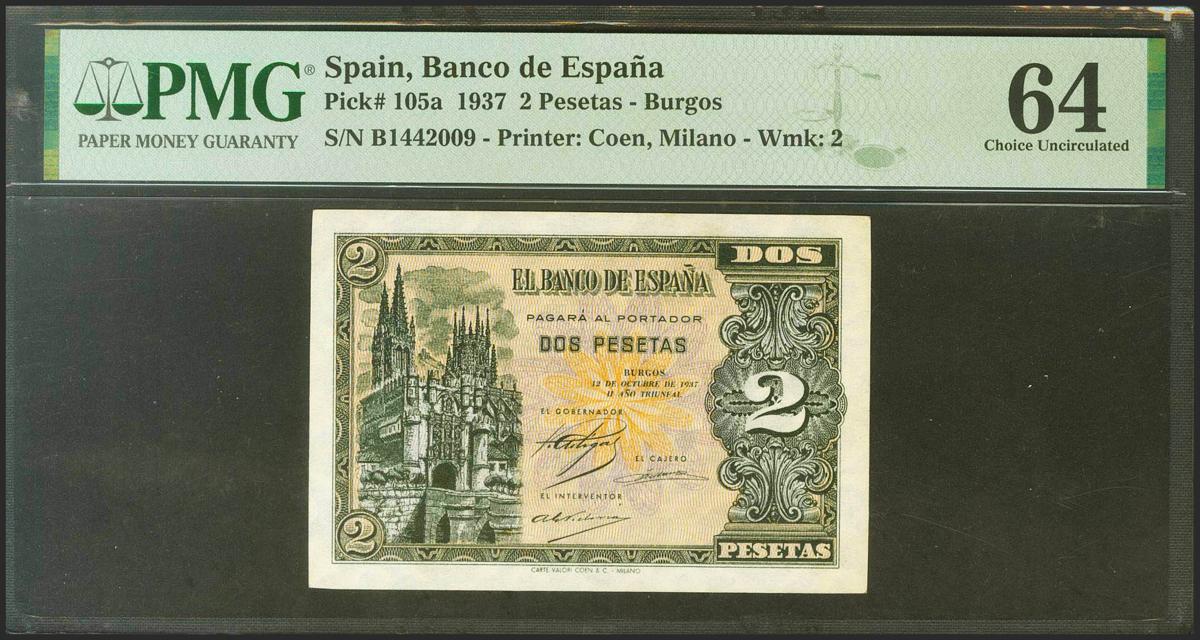 2 pesetas. October 12, 1937. Series B. (Edifil 2021: 426a, Pick: 105a). Rare in this quality. Uncirculated. PMG64 encapsulation.