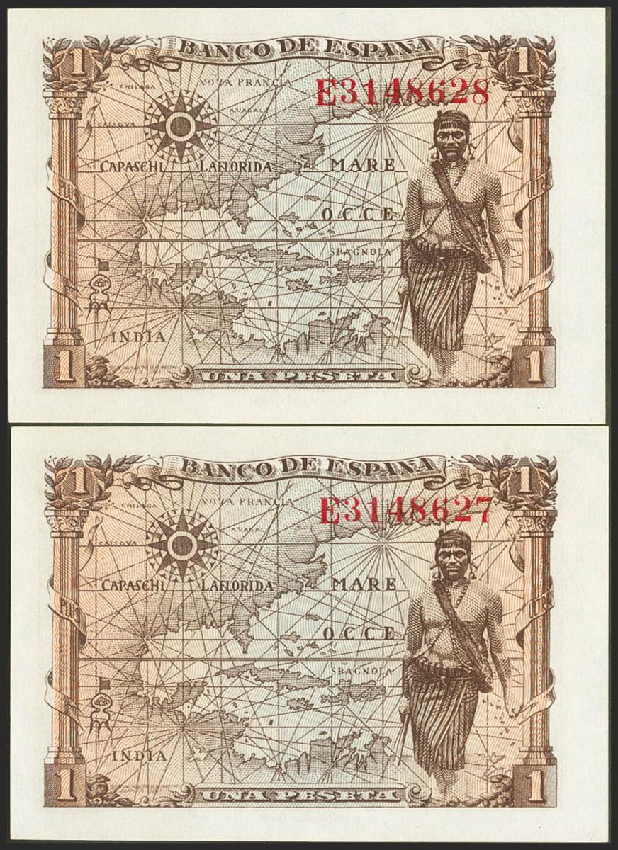 1 peseta. June 15, 1945. Correlative couple. Series E. (Edifil 2021: 448a). original sizing Uncirculated.