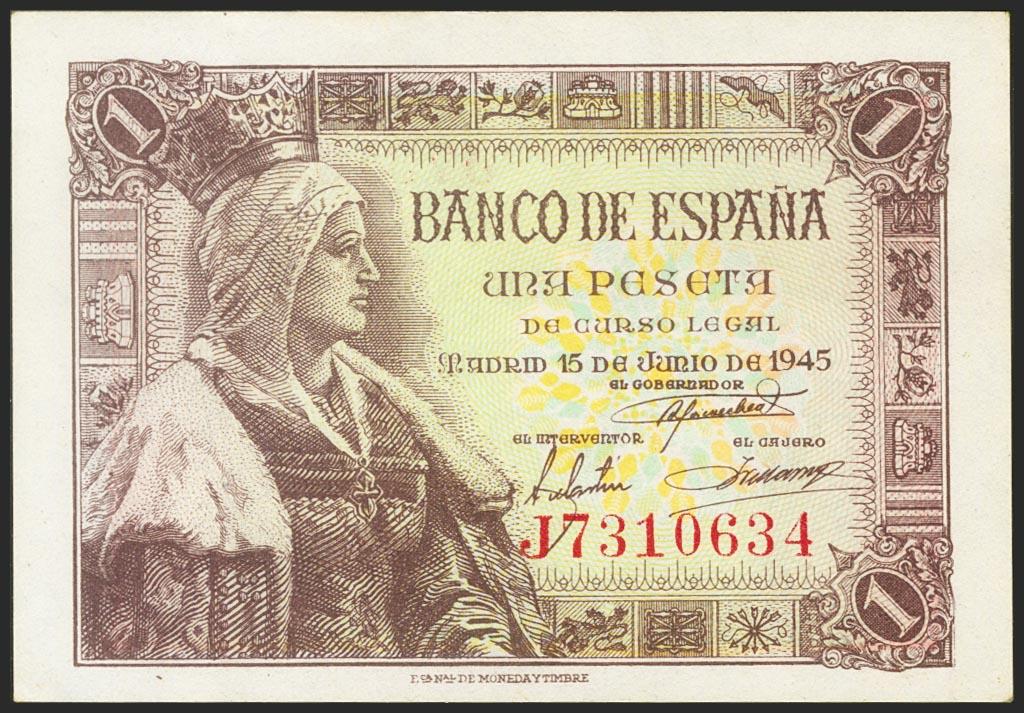 English 1 peseta. June 15, 1945. Series J. (Edifil 2021: 448a). original sizing Almost Uncirculated.