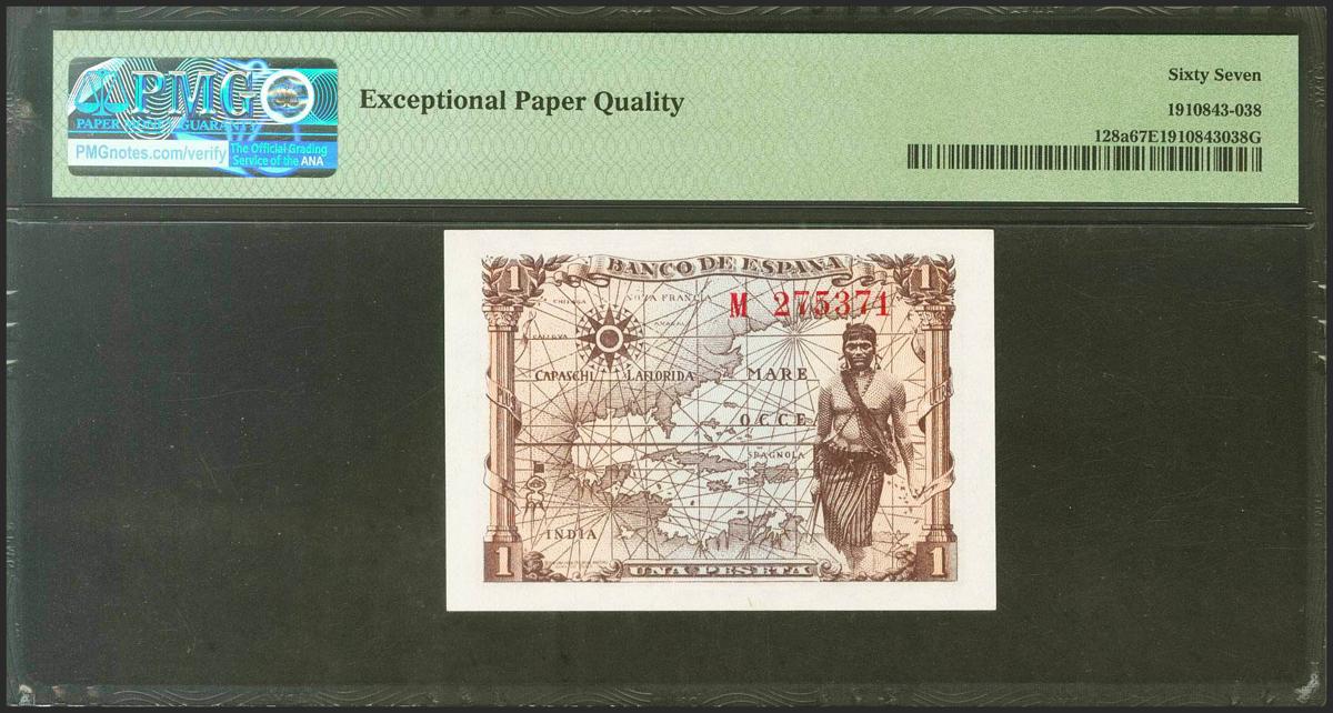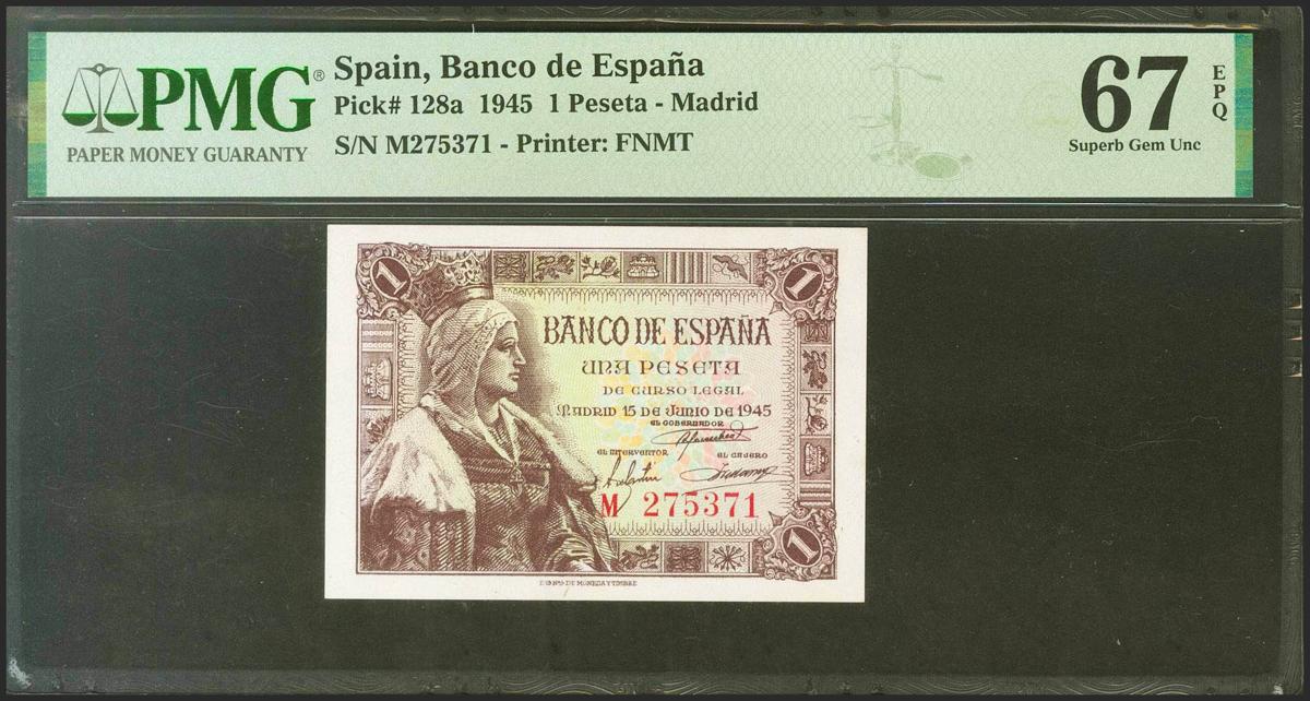 English 1 peseta. June 15, 1945. Series M, last series issued. (Edifil 2021: 448a, Pick: 128a). Rare in this exceptional original quality and sizing. Uncirculated. PMG67EPQ package.