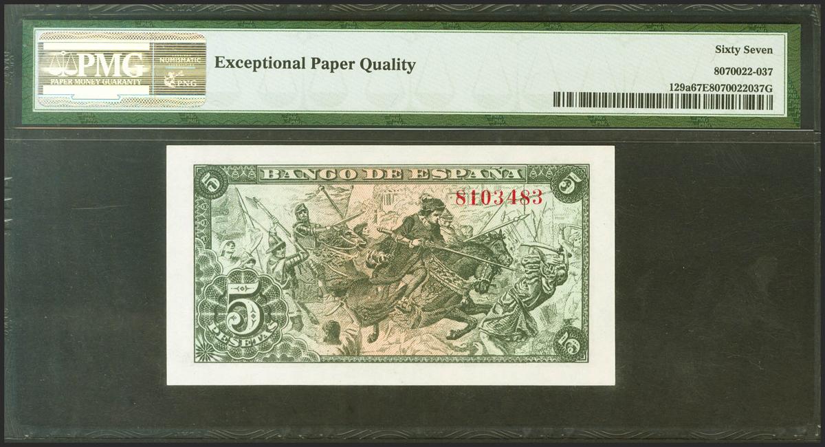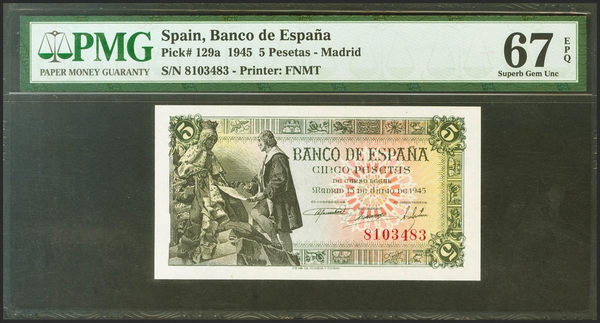 English 5 pesetas. June 15, 1945. No series. (Edifil 2021: 449, Pick: 129a). Extraordinarily rare in this quality, original sizing. Uncirculated. PMG67EPQ package.