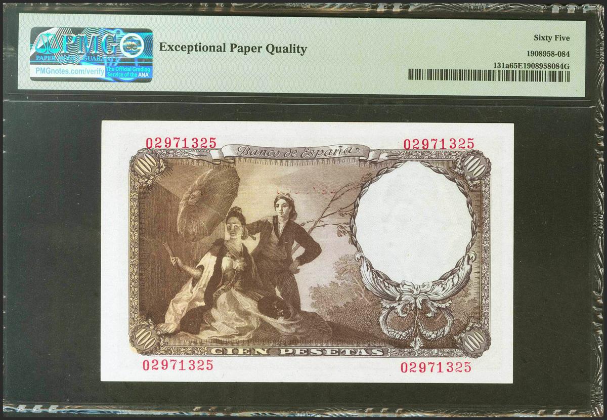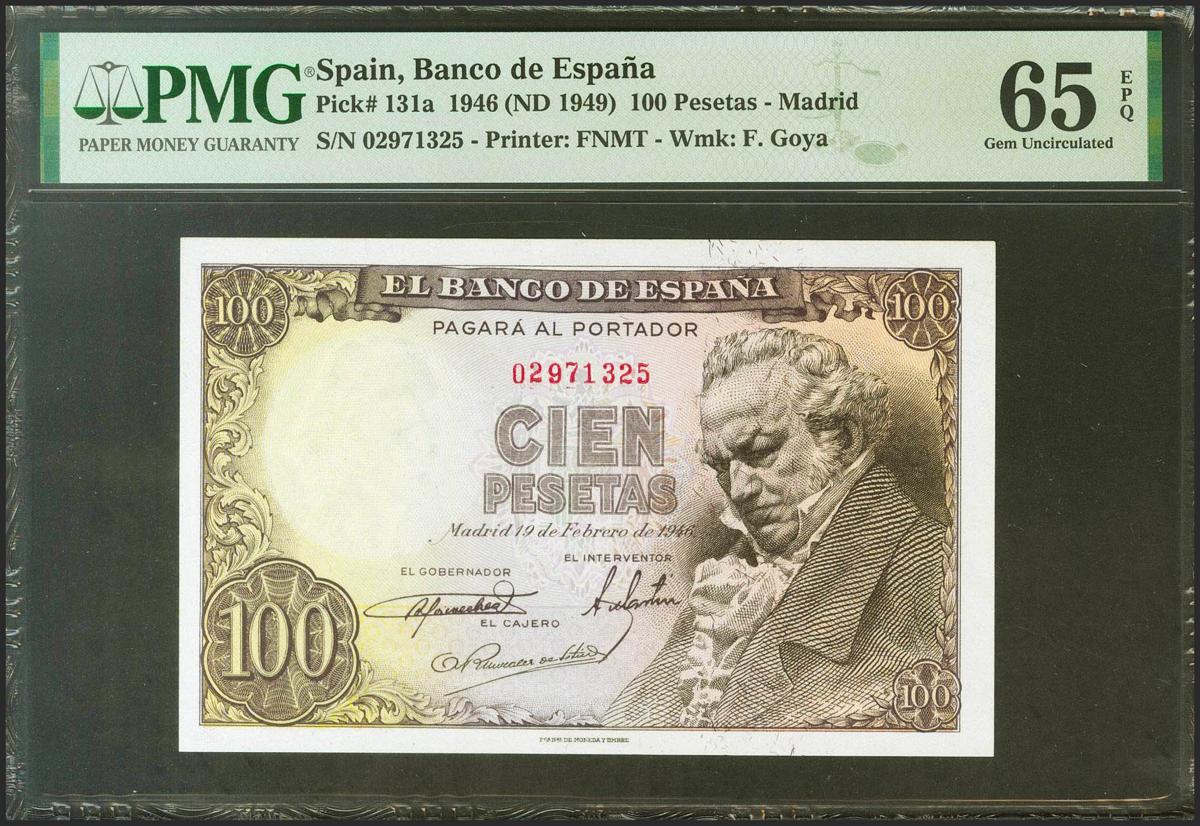 100 pesetas. February 19, 1946. No series. (Edifil 2021: 451, Pick: 131a). It retains all the original sizing. Uncirculated. PMG65EPQ package.
