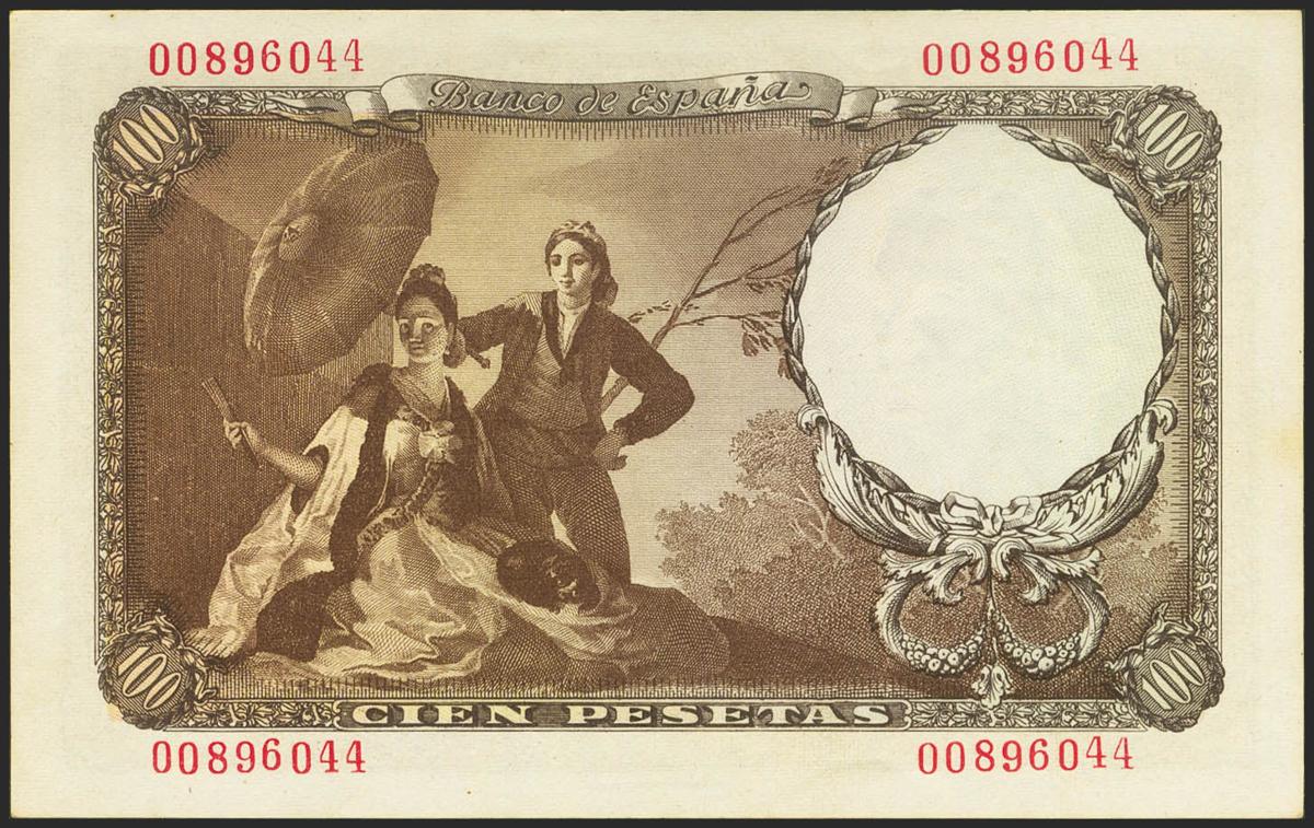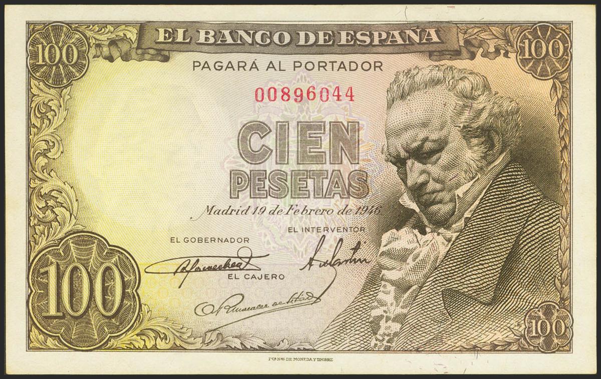 100 pesetas. February 19, 1946. No series. (Edifil 2021: 451). Rare in this quality, original sizing. Uncirculated.