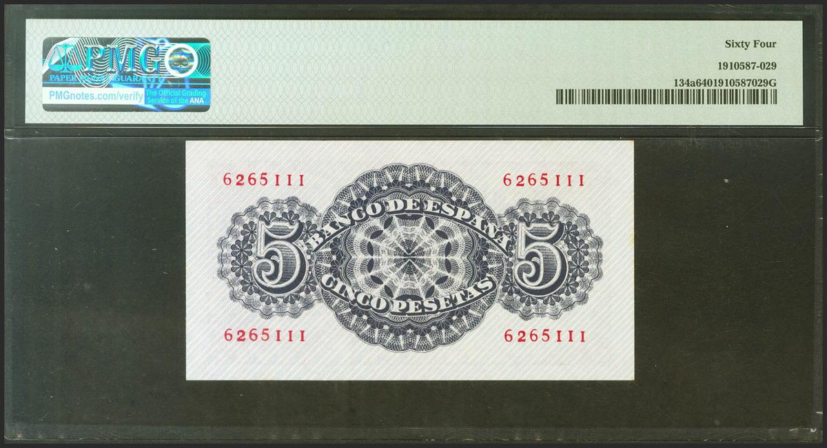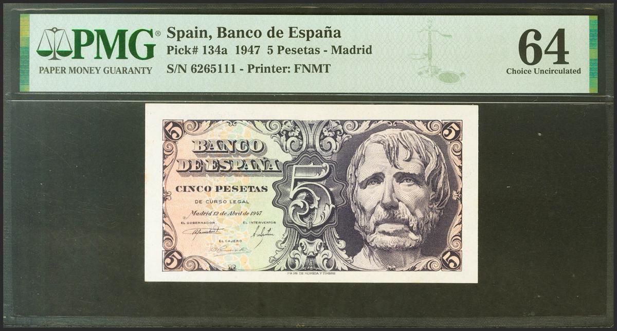 5 pesetas. April 12, 1947. No series. (Edifil 2021: 454, Pick: 134a). Uncirculated. PMG64 encapsulation.