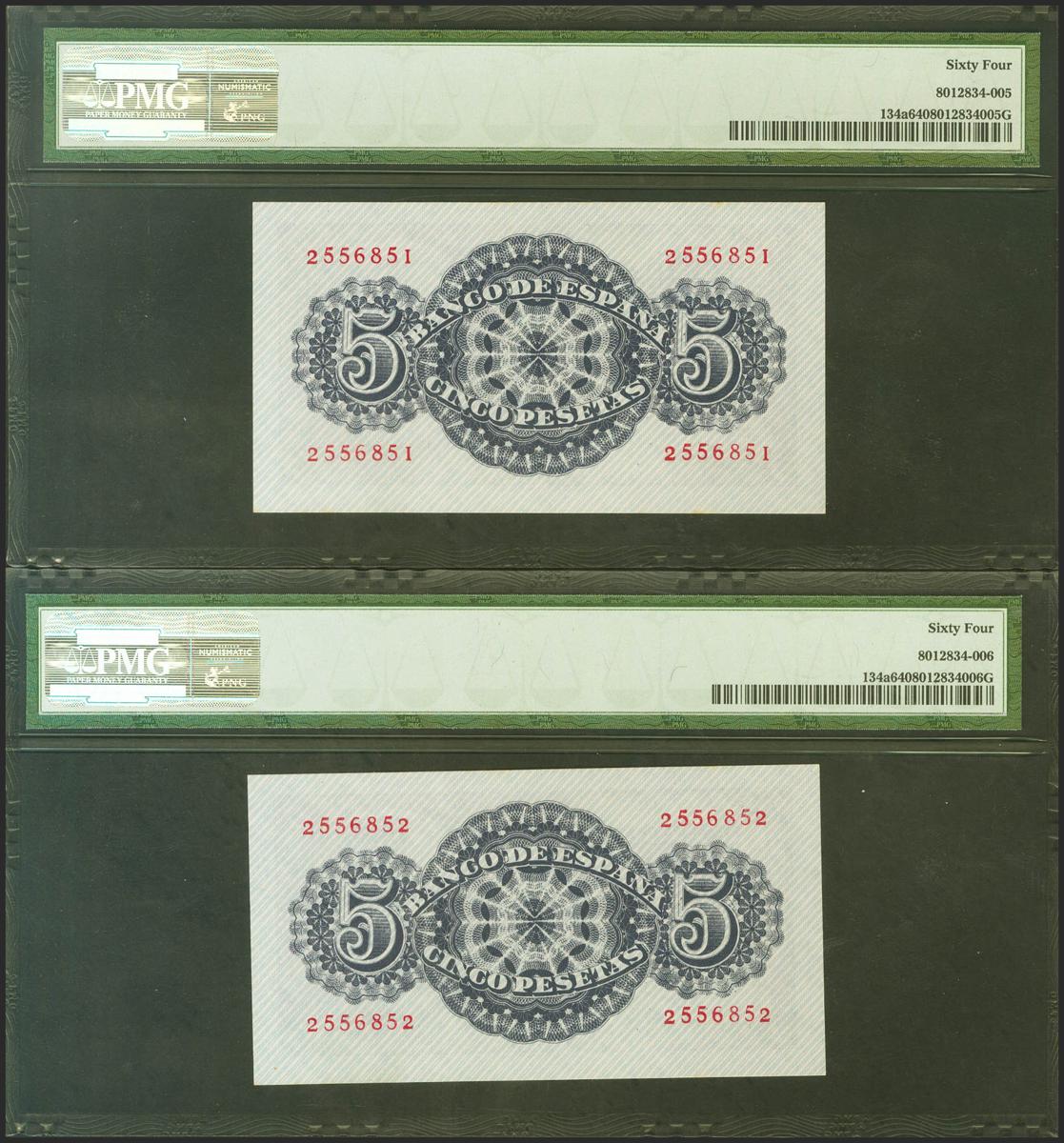 English 5 pesetas. April 12, 1947. Correlative couple. No serie. (Edifil 2021: 454, Pick: 134a). Uncirculated. PMG64 packages, both.