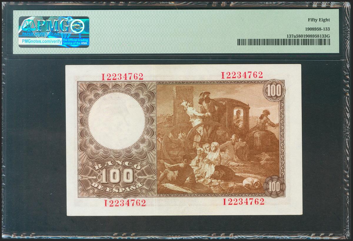 100 pesetas. May 2, 1948. Series I. (Edifil 2021: 456a, Pick: 137a). Rare in this quality. EBC++. PMG58 encapsulation.