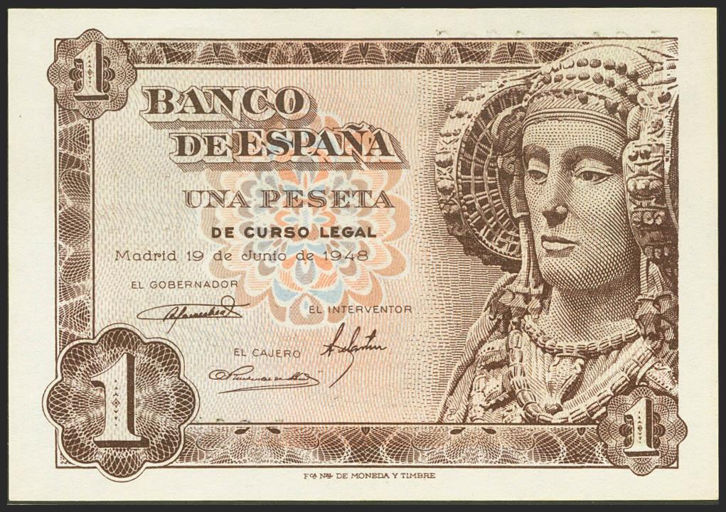1 peseta. June 19, 1948. Series L. (Edifil 2021: 457a). original sizing Almost Uncirculated.