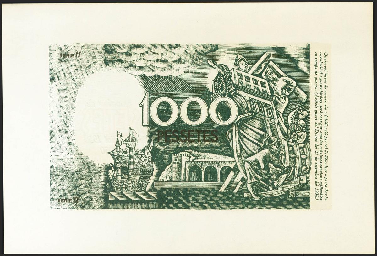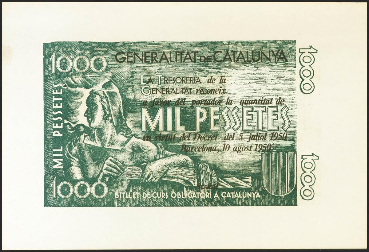 Proof in green of an Unissued 1000 Pesetas Generalitat de Catalunya banknote, issued on August 10, 1950, with the H series (privately issued banknote, without legal backing). Almost Uncirculated.