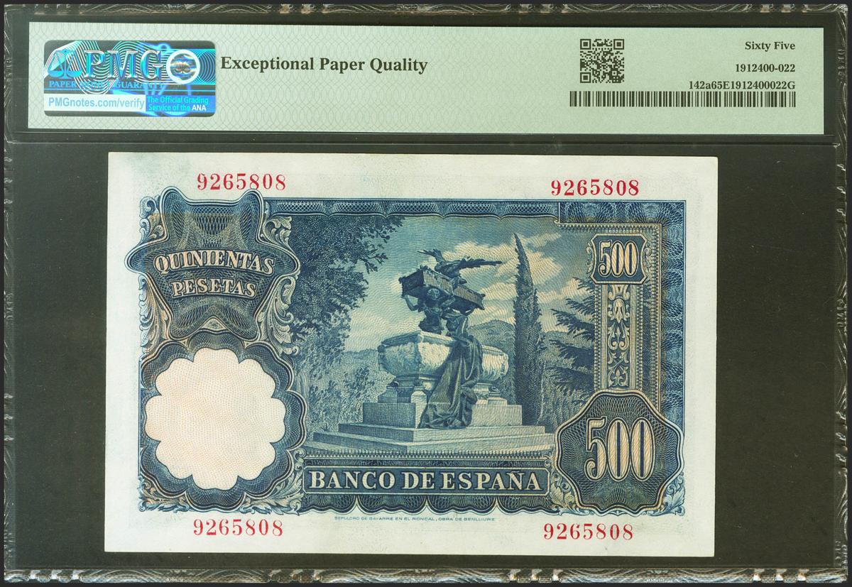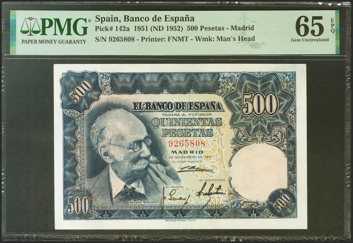500 pesetas. November 15, 1951. No series. (Edifil 2021: 460, Pick: 142a). Rare in this quality, original sizing. Uncirculated. PMG65EPQ package.