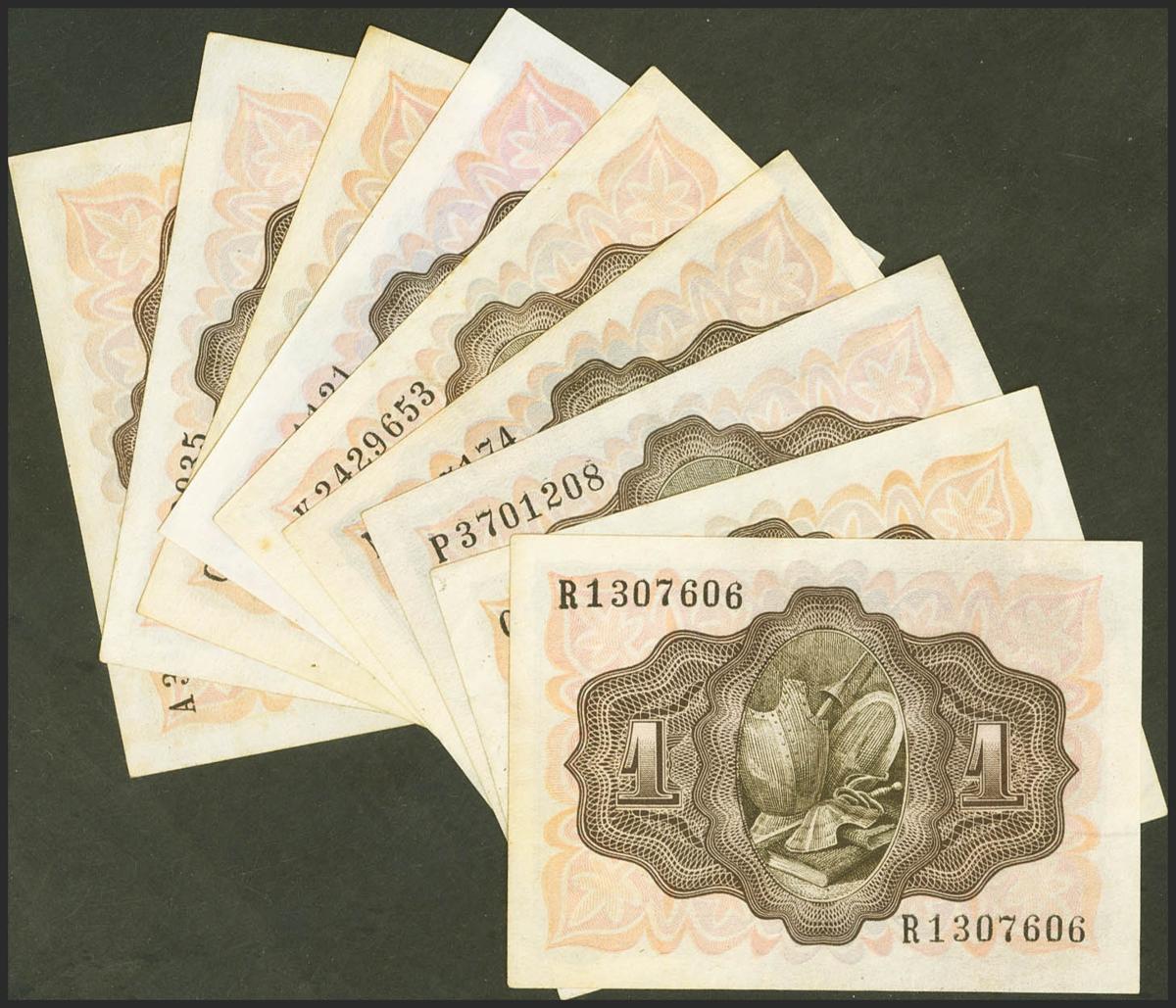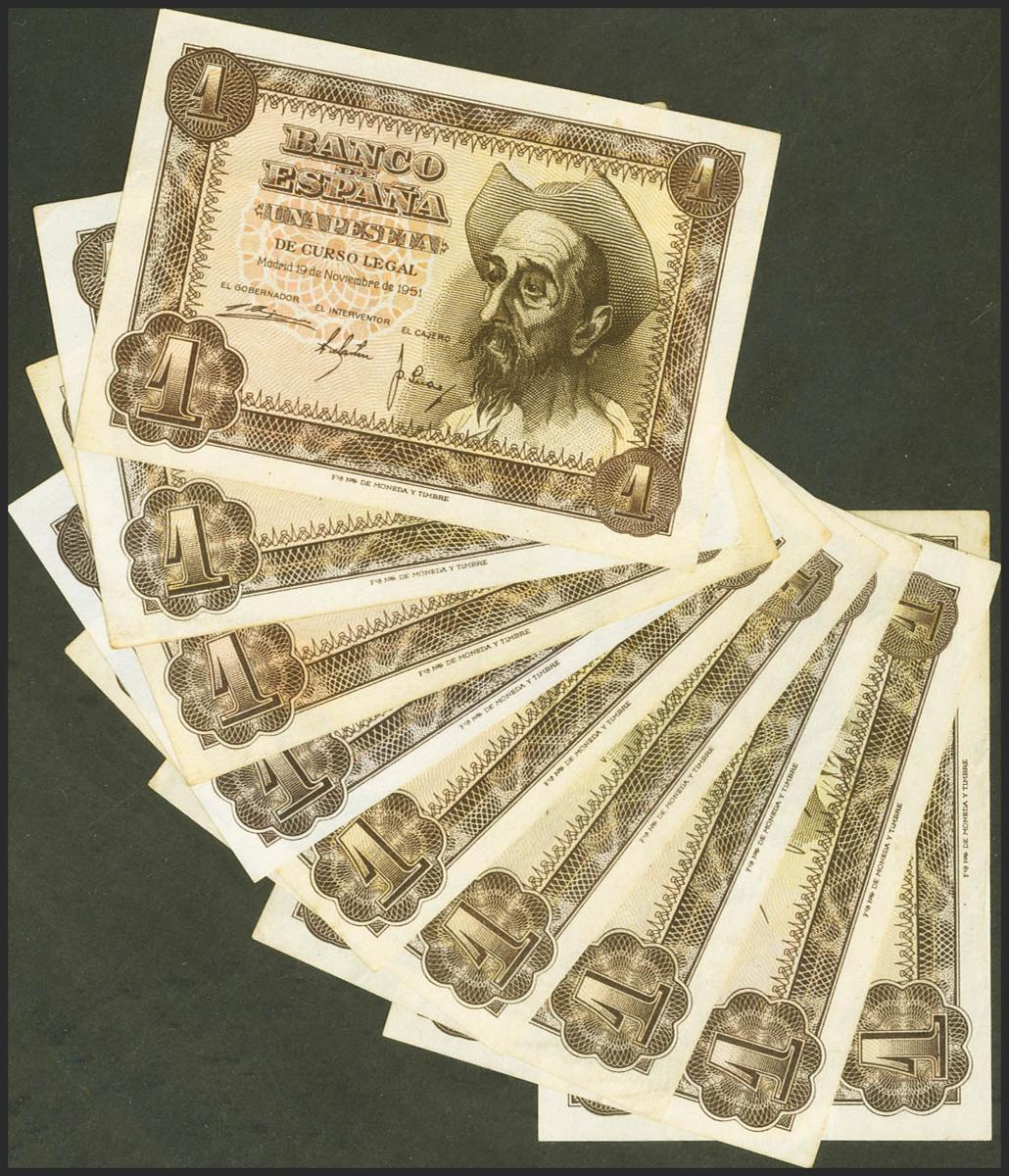English Set of 9 1 Peseta banknotes, issued on November 19, 1951, with the series A, E, G(2), K, N, P, Q and R, respectively (Edifil 2021: 461a), preserving its original size . Extremely Fine/ Good Extremely Fine.