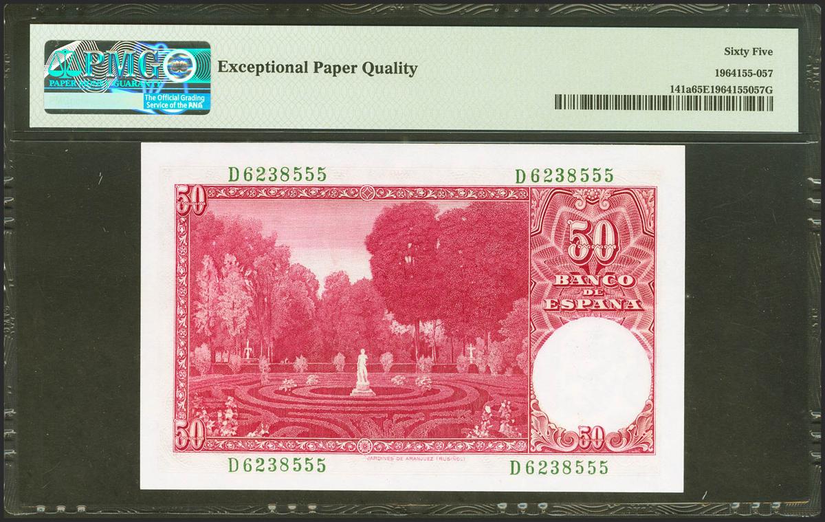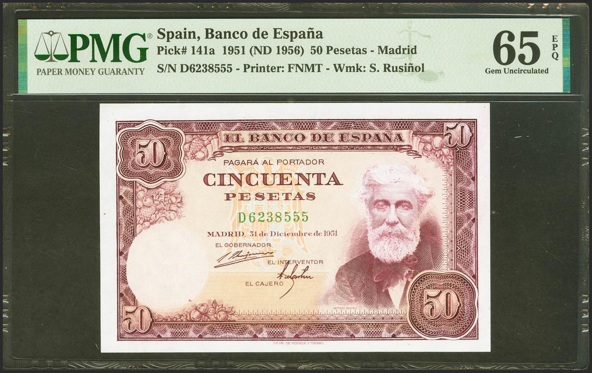 50 pesetas. December 31, 1951. Series D and in the absence of the cashier's signature. (Edifil 2021: 462c, Pick: 141a). Very rare and more in this exceptional quality, original sizing. Uncirculated. PMG65EPQ Package