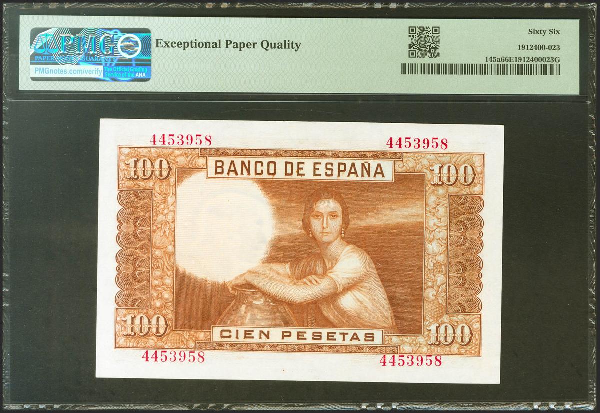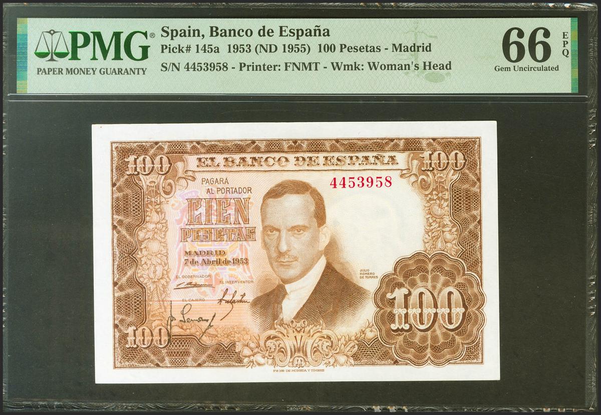 100 pesetas. April 7, 1953. No series. (Edifil 2021: 464, Pick: 145a). Rare in this exceptional quality, original sizing. Uncirculated. PMG66EPQ.